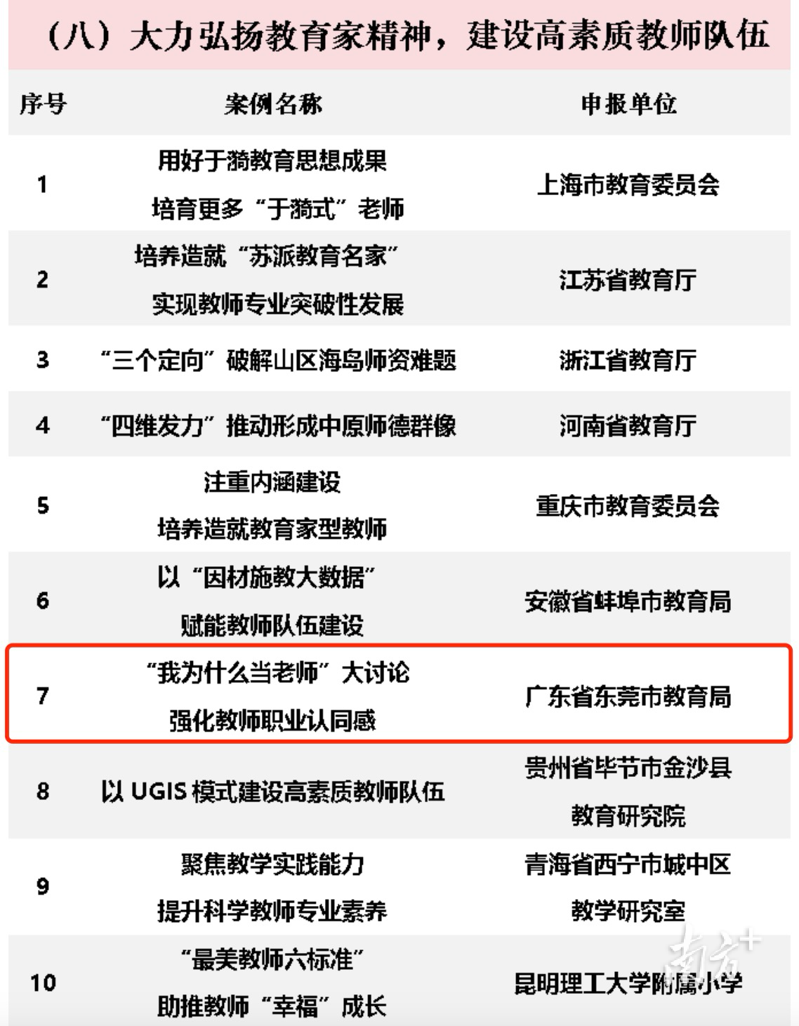 其中,“我为什么当老师”大讨论在“大力弘扬教育家精神,建设高素质教师队伍”类别中脱颖而出,成为东莞唯一入选的案例,也是广东省入选的五个案例之一。