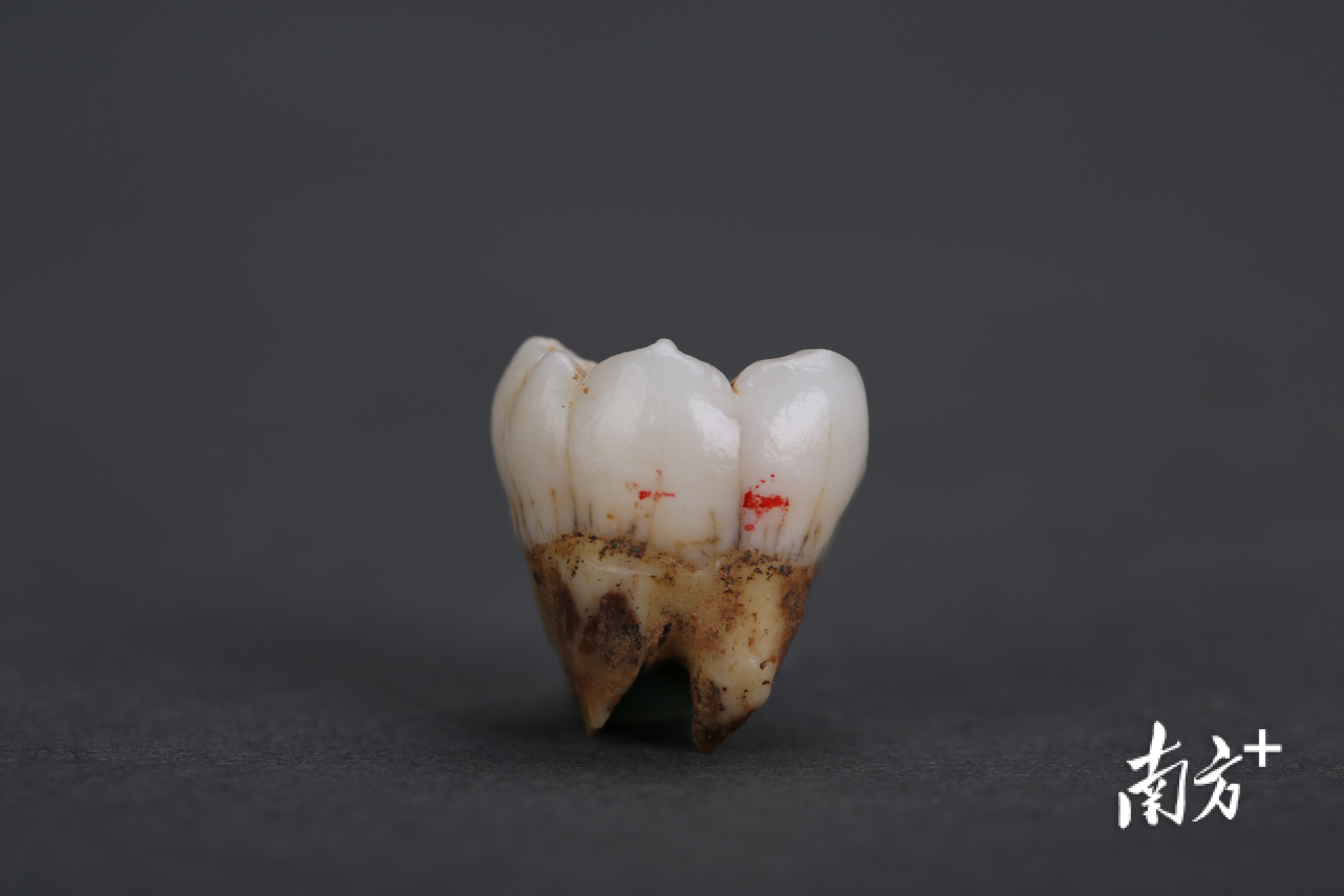 云浮蟠龙洞发现的远古智人牙齿化石。