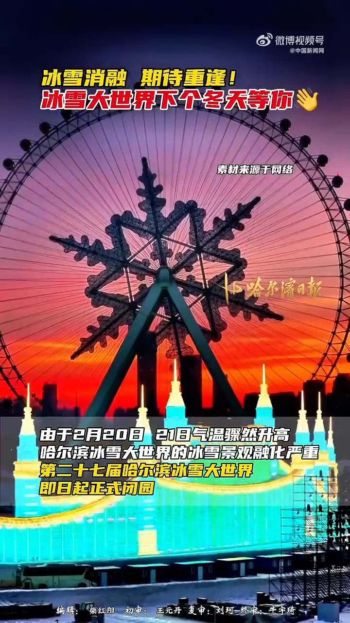 哈尔滨冰雪大世界21日发布公告:由于2月20日、21日气温骤然升高,突破历史极值,哈尔滨冰雪大世界的冰雪景观融化严重,为了保障游览体验和人身安全,第二十七届哈尔滨冰雪大世界即日起正式闭园,已购票的游客可通过原购票渠道申请全额退款。购买2026年2月20日(正月初四)-2月28日(正月十二)第二十七届哈尔滨冰雪大世界门票的游客,退票后可凭本人身份证免费游览下一届哈尔滨冰雪大世界。详情>>