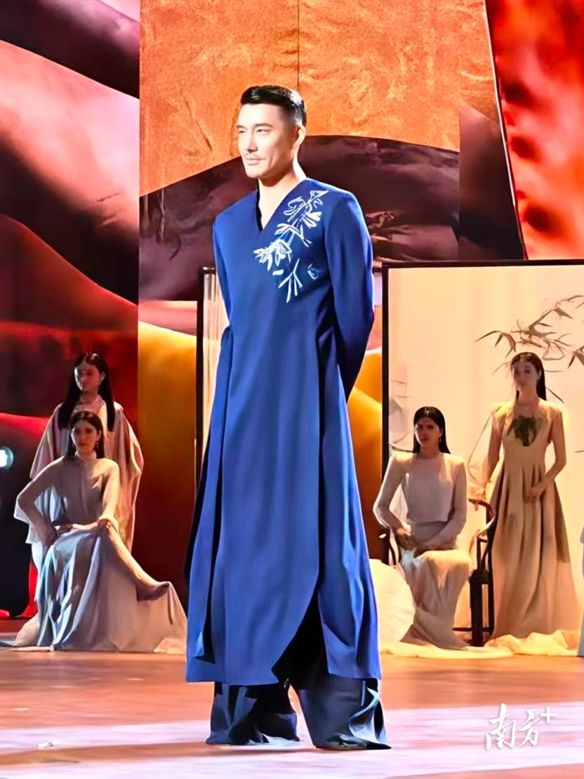 胡兵身着的长款蓝色风衣,是来自深圳品牌“德玺见萩”以香云纱量身定制的“战袍”。设计师大胆摒弃了香云纱传统的黑、棕主色,甄选了一抹沉稳而鲜活的蓝色,让古老面料脱离“厚重”的刻板印象,注入现代审美活力。