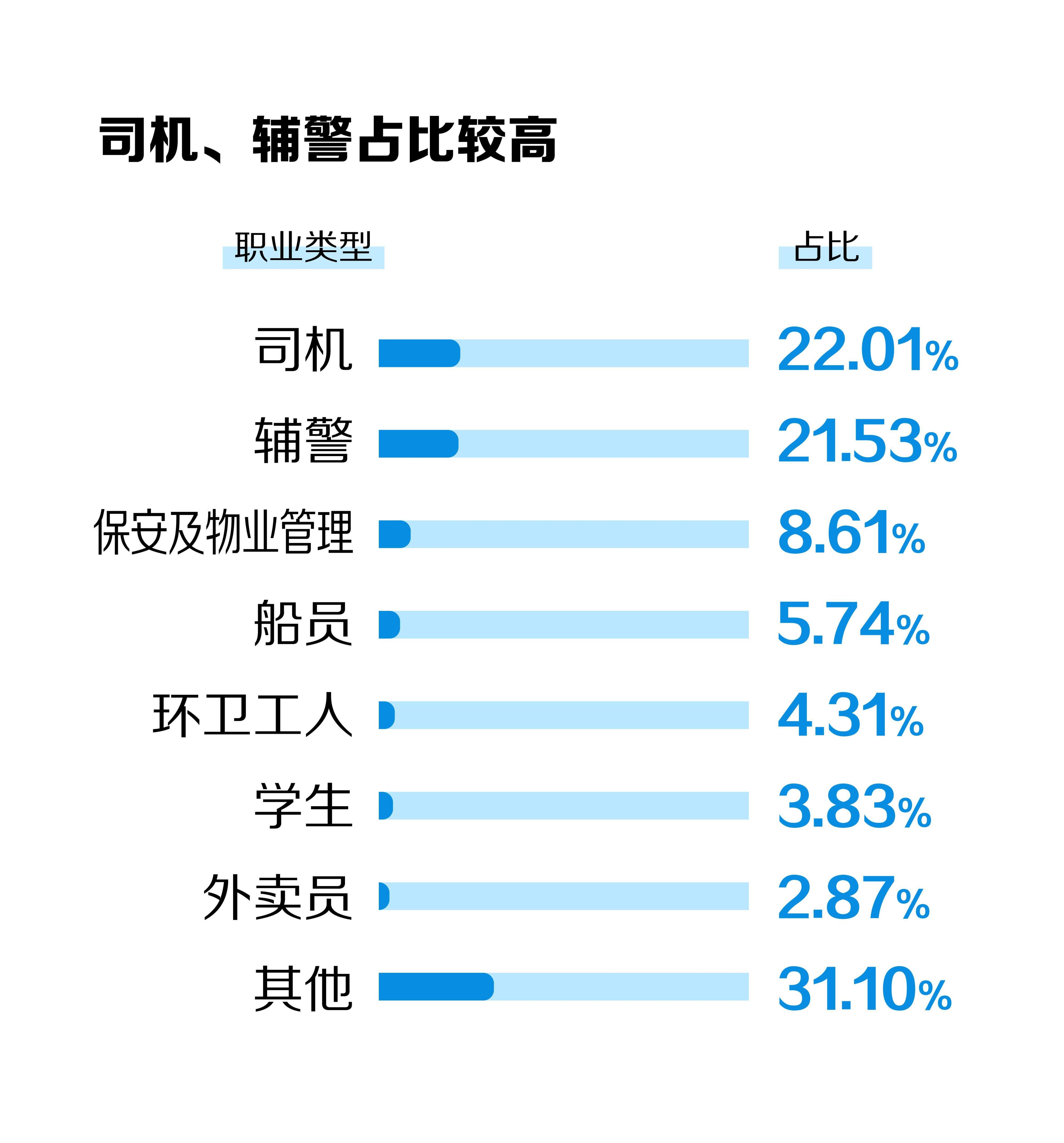 从性别分布来看,209名见义勇为人员中,男性187人,占比89.5%;女性22人,占比10.5%。相较于2024年的女性占比9%,女性见义勇为人员有所提升。年龄结构上,“90后”跃为见义勇为的“主力军”。职业类型分布中,司机、辅警成为见义勇为群体的两大核心群体,占比均超两成。其中,司机占比22.01%,辅警占比21.53%。好人一生平安>>
