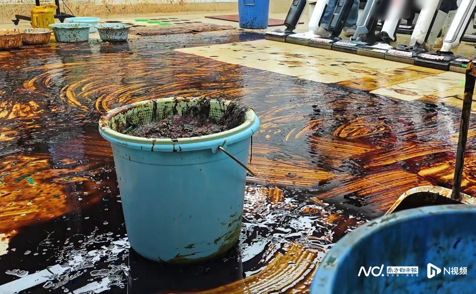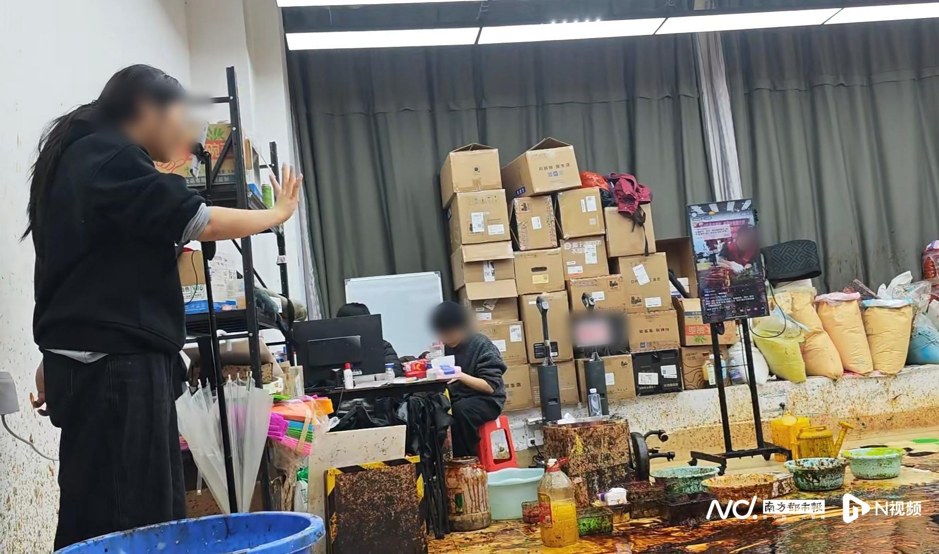 “老*洗地机测评”线下直播间里制造的脏污场景。南都N视频记者拍摄