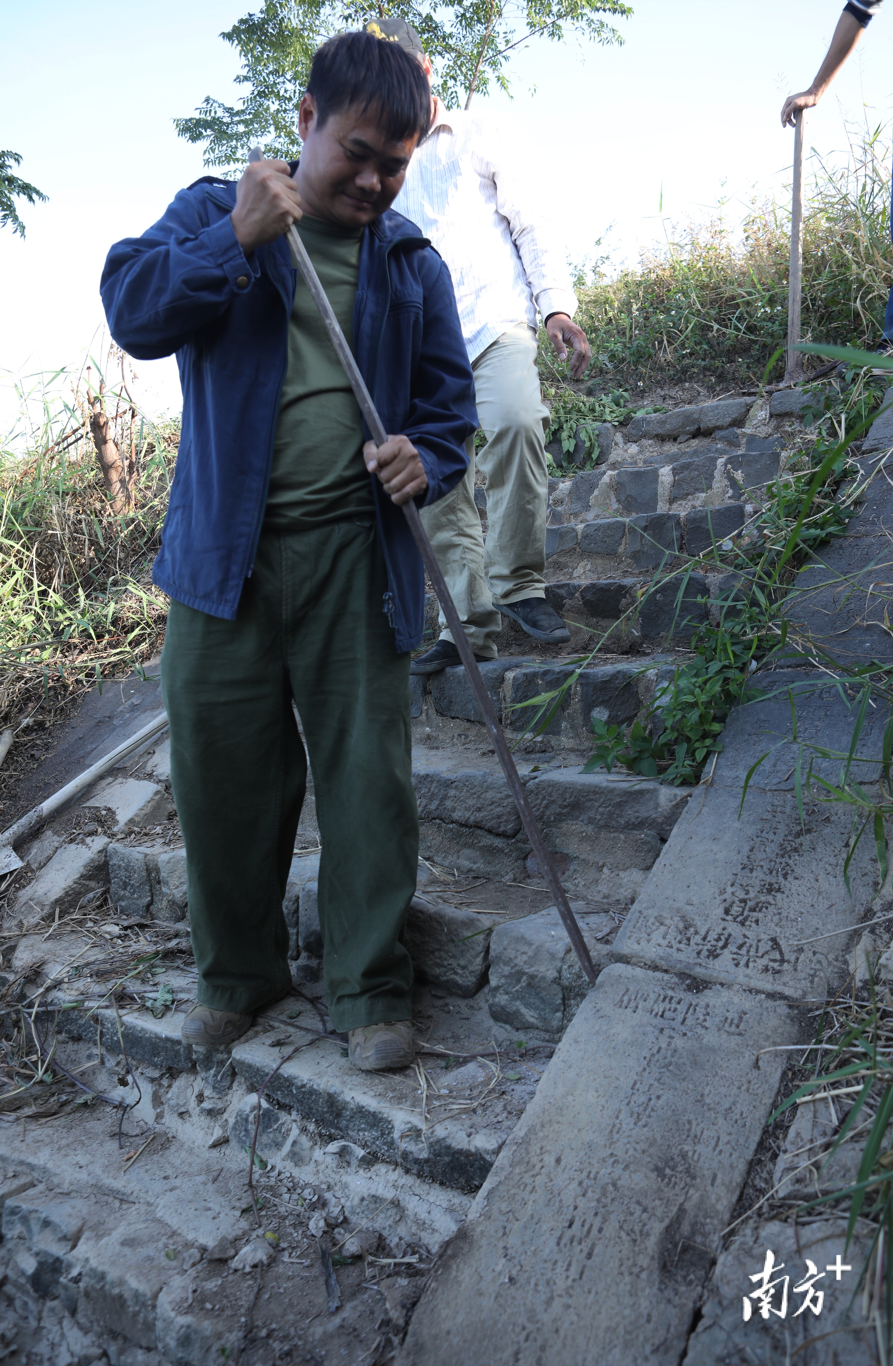 2019年12月21日,余国强与同事在即将拆除的阶梯处,抢救性收集石碑与石墩。
