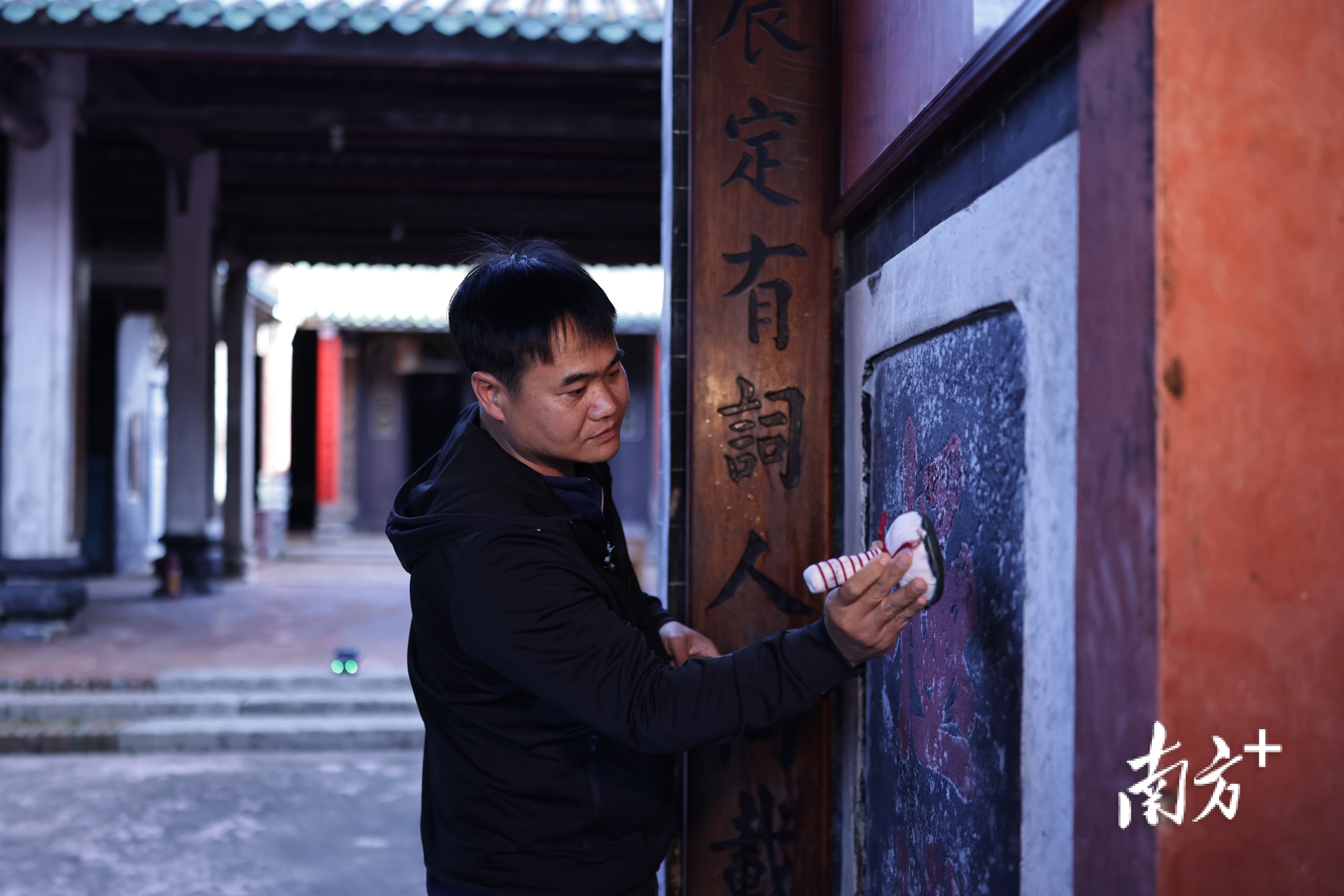 2026年2月15日,余国强在古建筑里给石碑制作拓片。