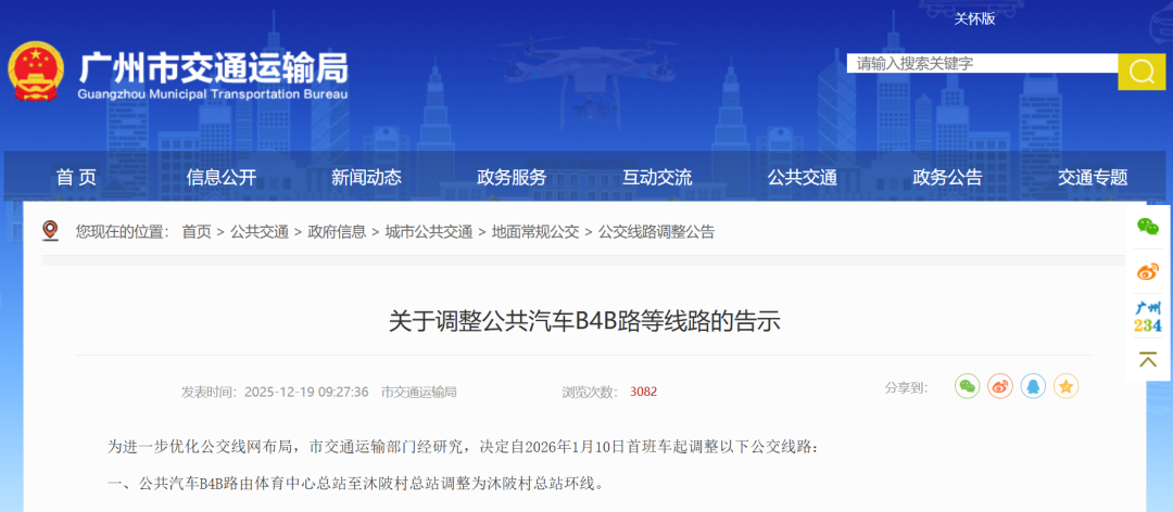 12月19日,广州市交通运输局发布《关于调整公共汽车B4B路等线路的告示》。