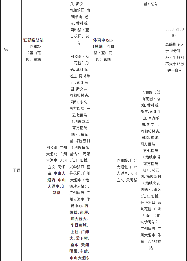 二、公共汽车B6路由汇彩路总站至同和路(蓝山花园)总站调整为体育中心BRT总站至同和路(蓝山花园)总站。