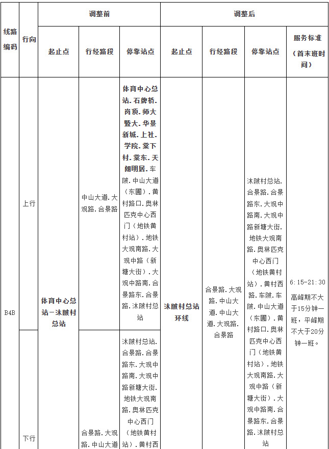 一、公共汽车B4B路由体育中心总站至沐陂村总站调整为沐陂村总站环线。