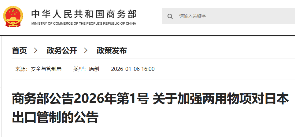 前不久,商务部发布了2026年第1号公告,宣布即日起加强两用物项对日出口管制: