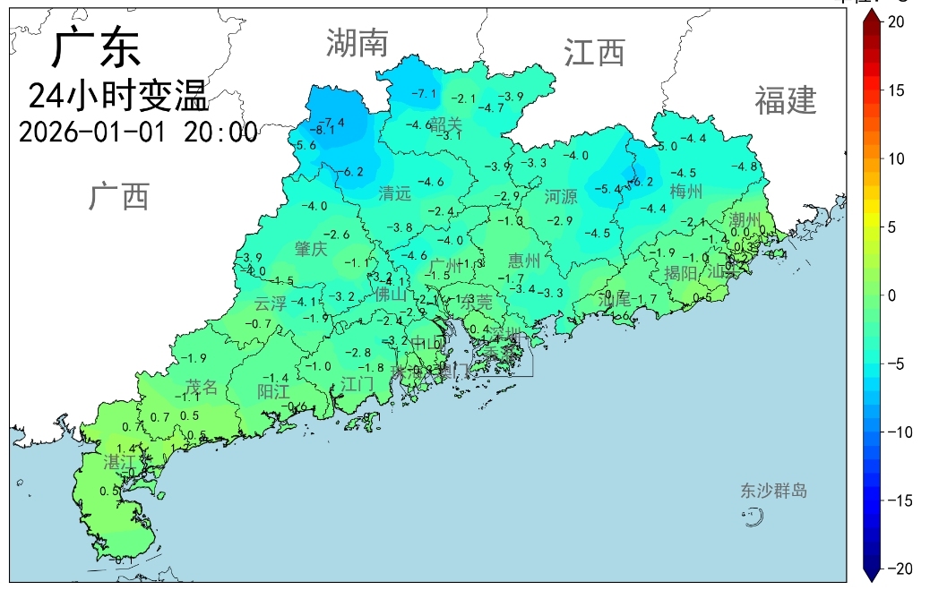 在昨天早晨,冷空气前锋开始进入粤北并南下影响广东。其中,韶关和清远北部市县白天最高气温较2025年12月31日下降了6℃—11℃,韶关南部、清远南部、河源、梅州、肇庆市县较31日下降了2℃—6℃。