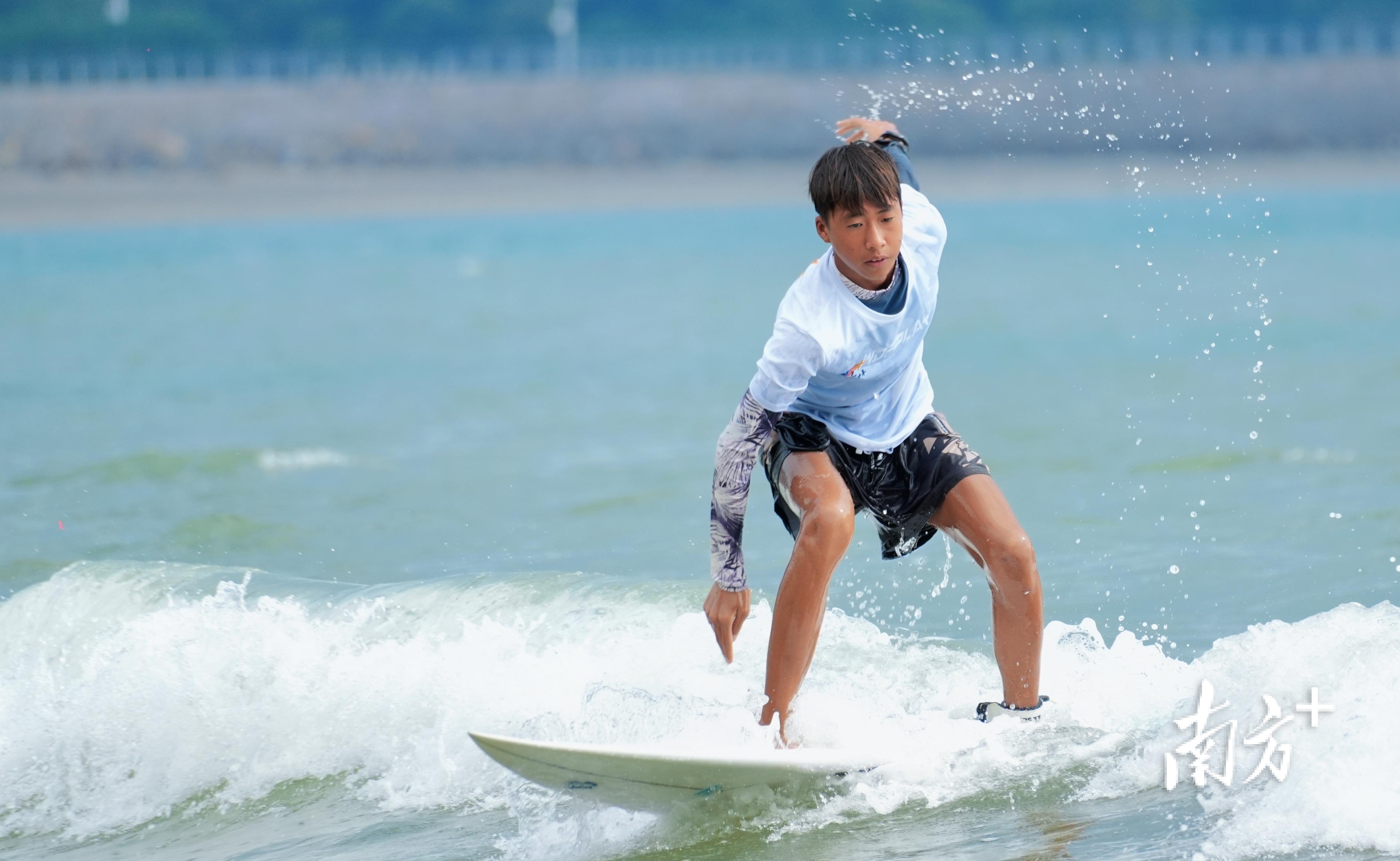 深广的湾腹、稳定的浪涌与平缓的浅滩,共同构成了青澳湾在冲浪界无可替代的天然优势。赞美这片海域时,来自汕头潮阳海门镇的林海涛脸上洋溢着自豪,“我们海边长大的孩子,骨子里就适合冲浪!”