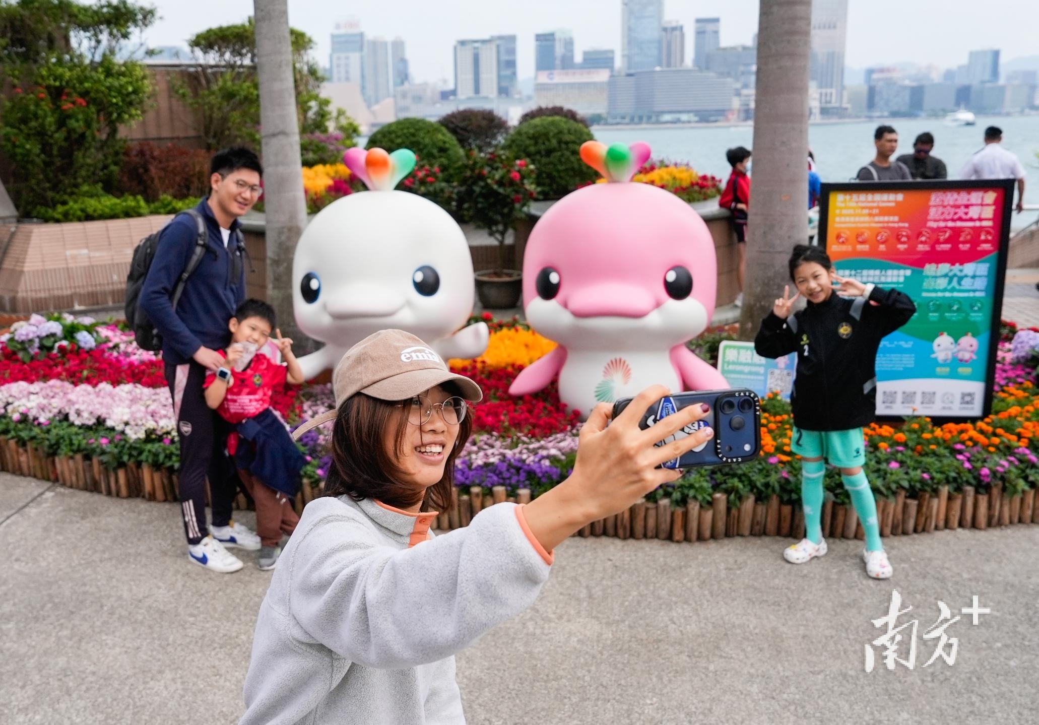 行走在香港维多利亚公园,十五运会吉祥物“喜洋洋”与“乐融融”随处可见,“激情全运会活力大湾区”的旗帜随处可见;在澳门的十五运会特许商店里,带有传统文化元素的徽章、冰箱贴和玩偶,深受消费者喜爱。