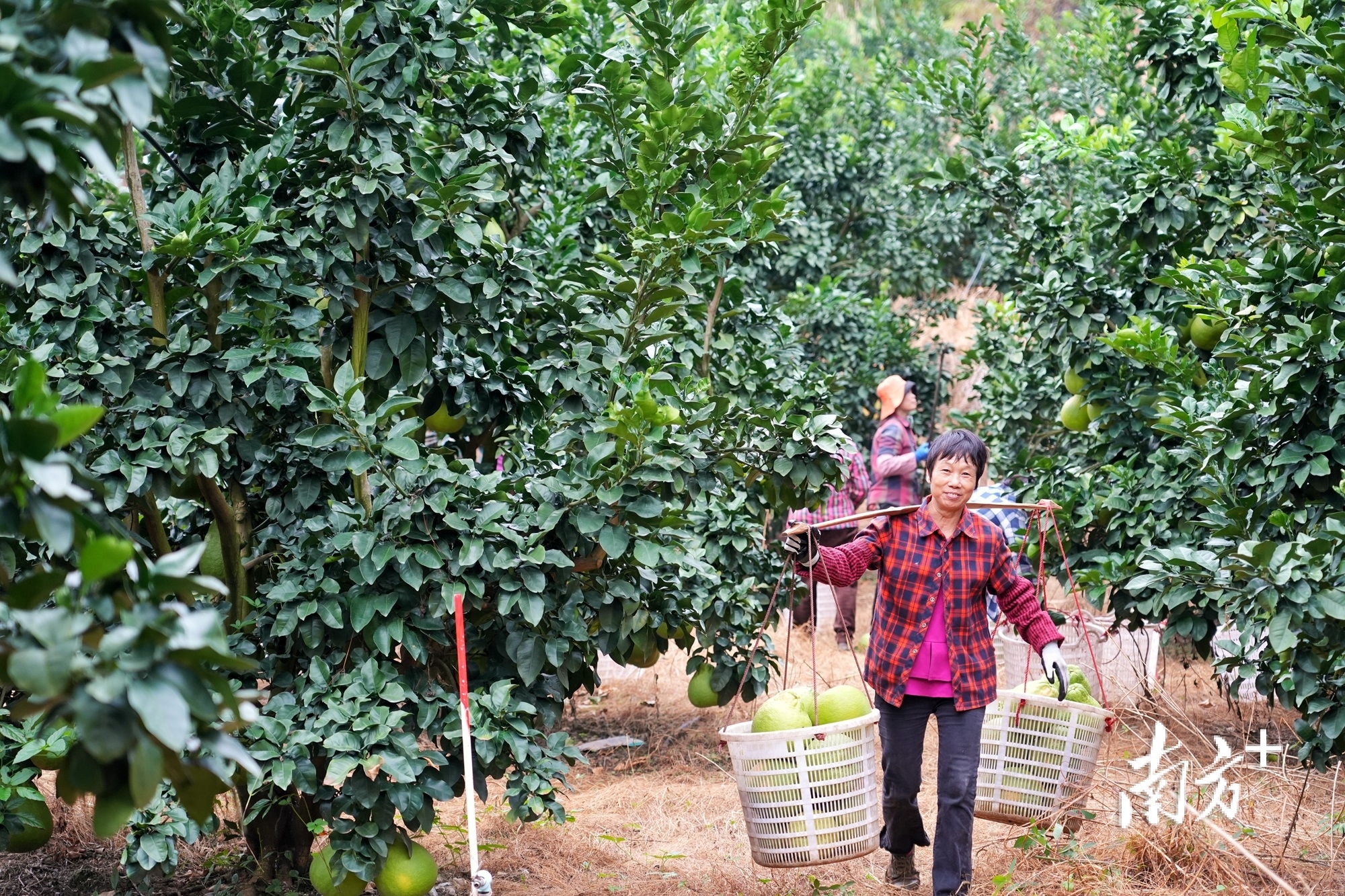 作为集生产示范、生态旅游于一体的广东省农业现代化示范基地,2024年南福金柚种植基地种植金柚5000多亩,产量约2500万斤,产值约5750万元;种植户440户,通过种植金柚人均年增收2.88万元,占全部收入超80%。