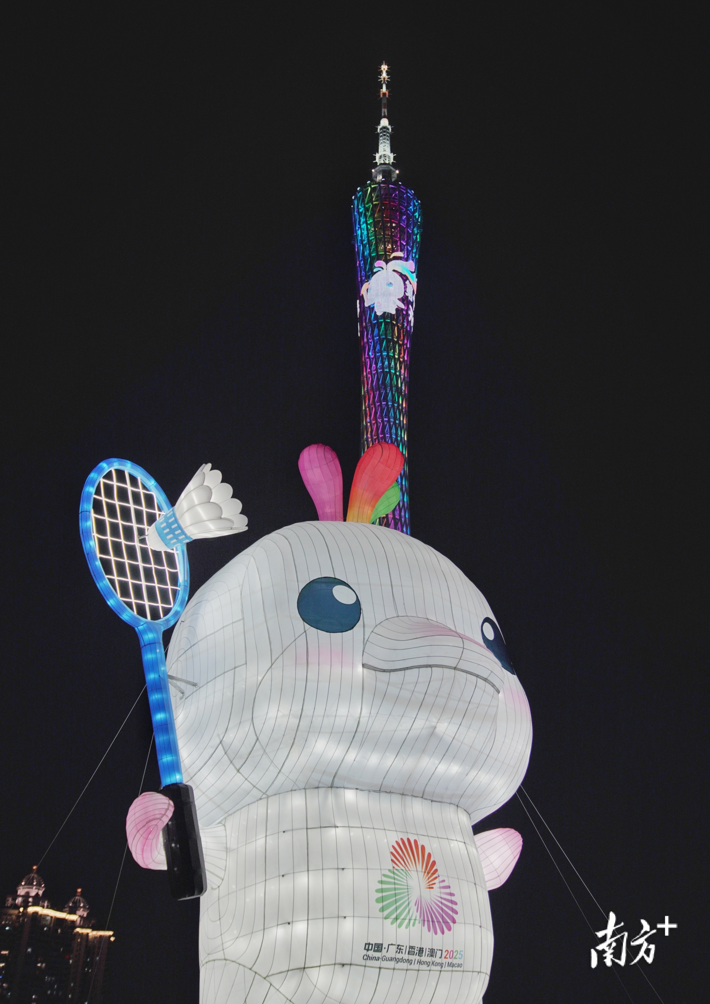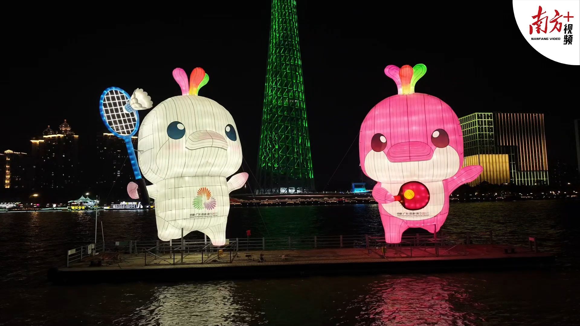 11月1日,广州塔下的珠江江面迎来一场璀璨的视觉盛宴——两座高达15米的十五运会吉祥物“喜洋洋”“乐融融”大型装置正式亮相。这一珠江上大型吉祥物漂浮装置,作为十五运会和残特奥会广州赛区景观与氛围营造的重点项目,以独特的创意构思与岭南文化表达,为全运会的到来注入热烈氛围,也为广州的城市夜空增添亮丽风景。