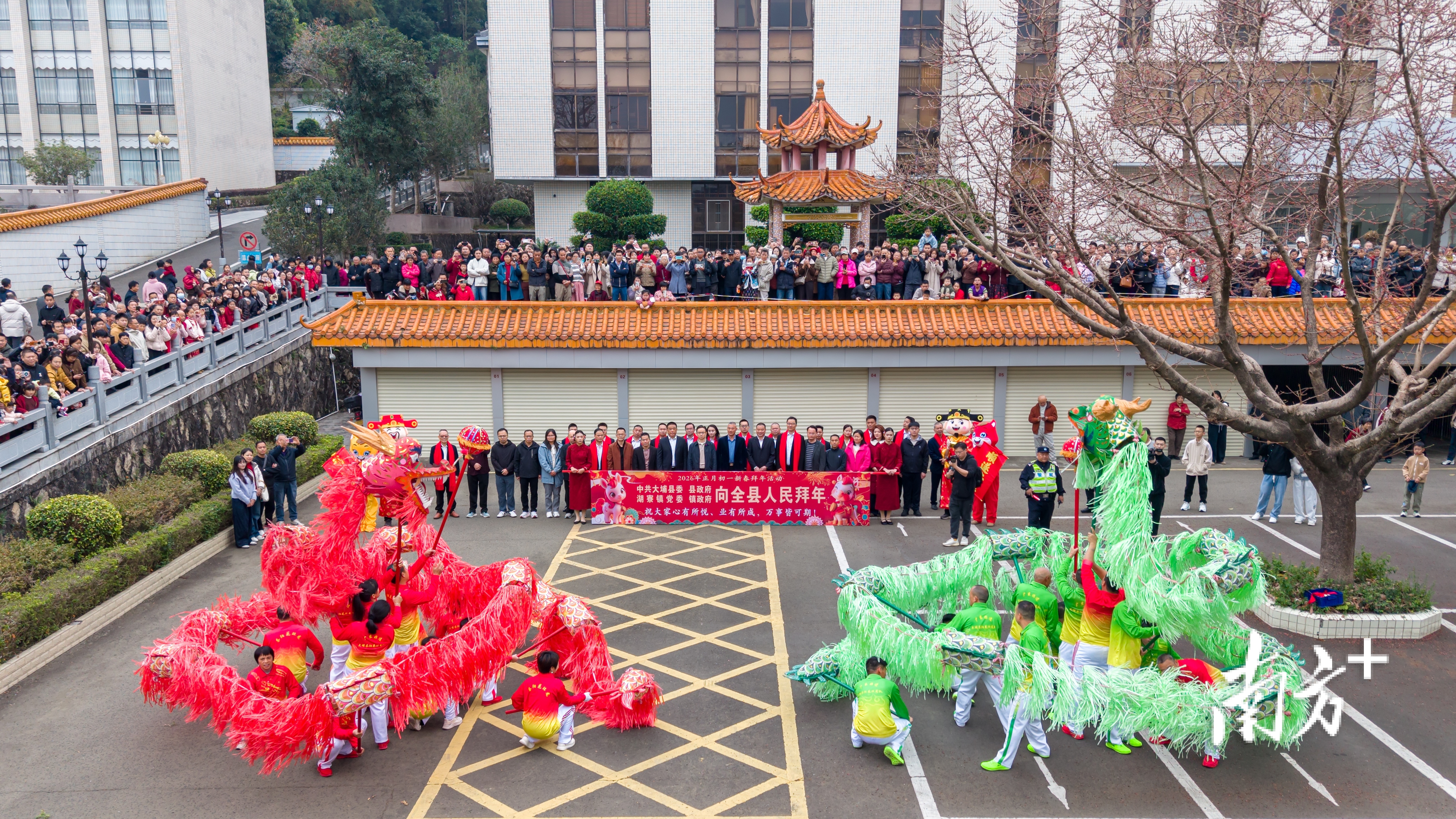 2月17日,农历正月初一,大埔县城处处张灯结彩,洋溢着喜庆祥和的节日气息。上午9时,一场热闹的新春拜年活动在湖寮镇人民政府院内拉开帷幕。由花环龙、舞狮、锣鼓、鲤鱼灯、龙珠灯等多个非遗表演队组成的巡游队伍整装待发,在欢腾的锣鼓声中浩浩荡荡地向大埔县人民政府前进,用一场年味浓郁、非遗荟萃的新春巡游,向全县人民送上丙午马年的美好祝福。