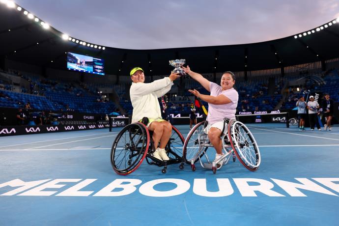 北京时间1月30日,2026澳网轮椅网球女双决赛,头号种子、中国组合王紫莹/李晓辉以6-4、6-3击败2号种子朱珍珍/上地结衣,实现卫冕。中国选手朱珍珍和搭档上地结衣收获亚军。