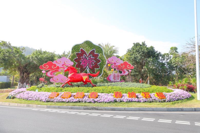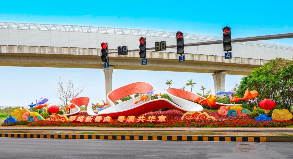 横琴大桥南的造景以奔腾的骏马搭配明艳的祥云,气势昂扬。各色鲜艳花卉错落点缀,构成热烈缤纷的新春氛围。
