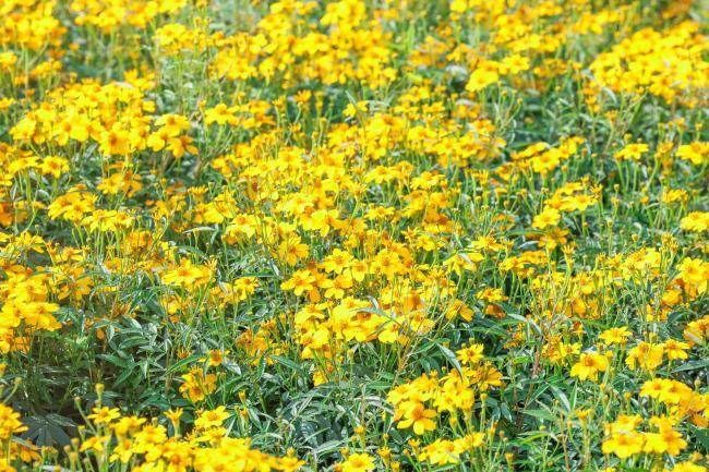 花海长廊1号驿站簕杜鹃园旁,1200平方米的芳香万寿菊花海以灿烂的金黄色为主色调,如同阳光洒落在大地上,温暖又治愈。花朵散发着淡甜的果香,叶片自带清甜气息,沁人心脾的同时,还能有效驱赶蚊虫。