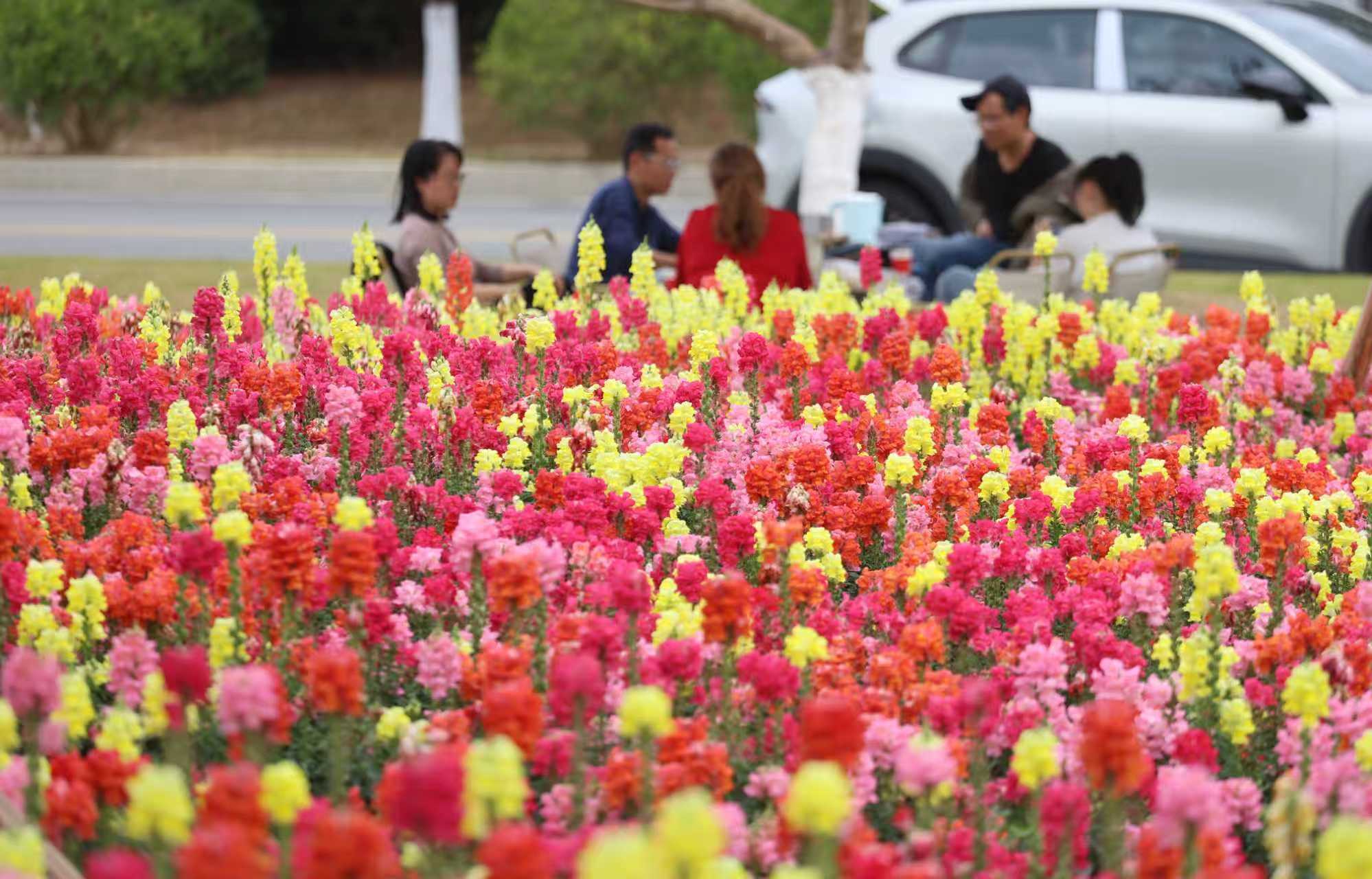 花海长廊5号驿站周边,15000平方米的金鱼草花海与2000平方米的相思梅花海,正肆意绽放。红的热烈、粉的温柔、黄的明媚、橙的鲜活……色彩斑斓、层次丰富。微风拂过,花枝轻轻摇曳,宛如一群灵动的小精灵,充满生机与活力。