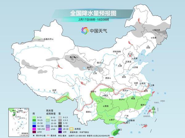 江南大部、西南地区东部、华南南部和西部等地部分地区有小雨,其中,海南岛等地部分地区有中雨。