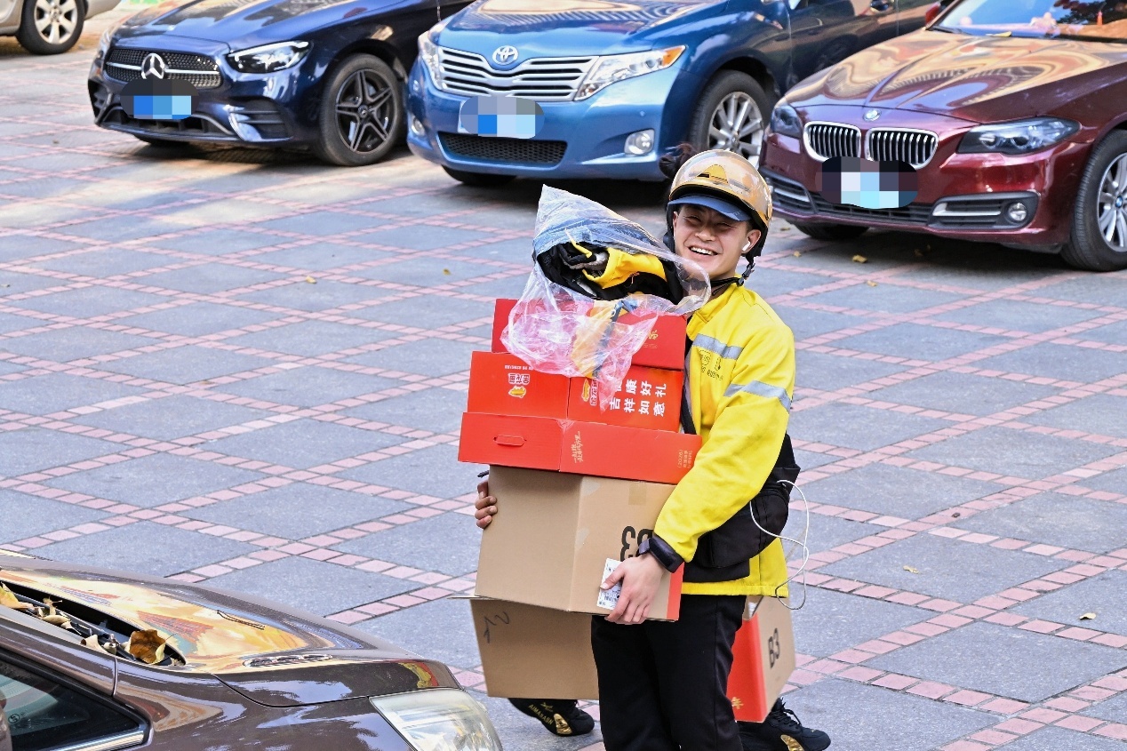 一位骑手抱着刚领到的米面粮油、春节礼盒等年货,满载而归。 向锦航 摄