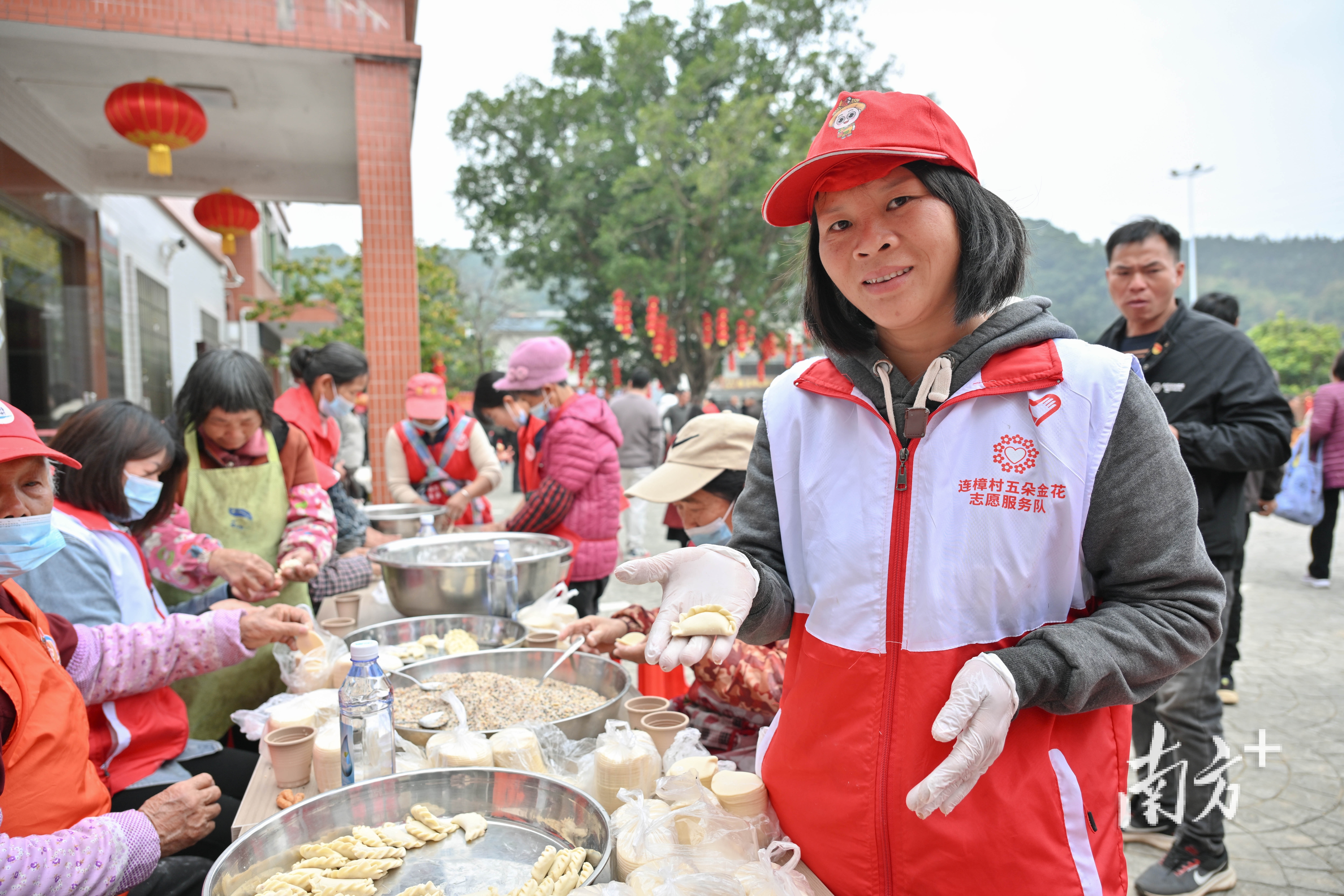炸货区的油锅已烧热,金黄的糖环、油糍在热浪中翻滚。连樟村五朵金花志愿服务队的志愿者们端着大铁盘,招呼路过的村民,“新鲜滚热辣,快来尝一下!”孩子们围着铁盘,拿了一个又一个。