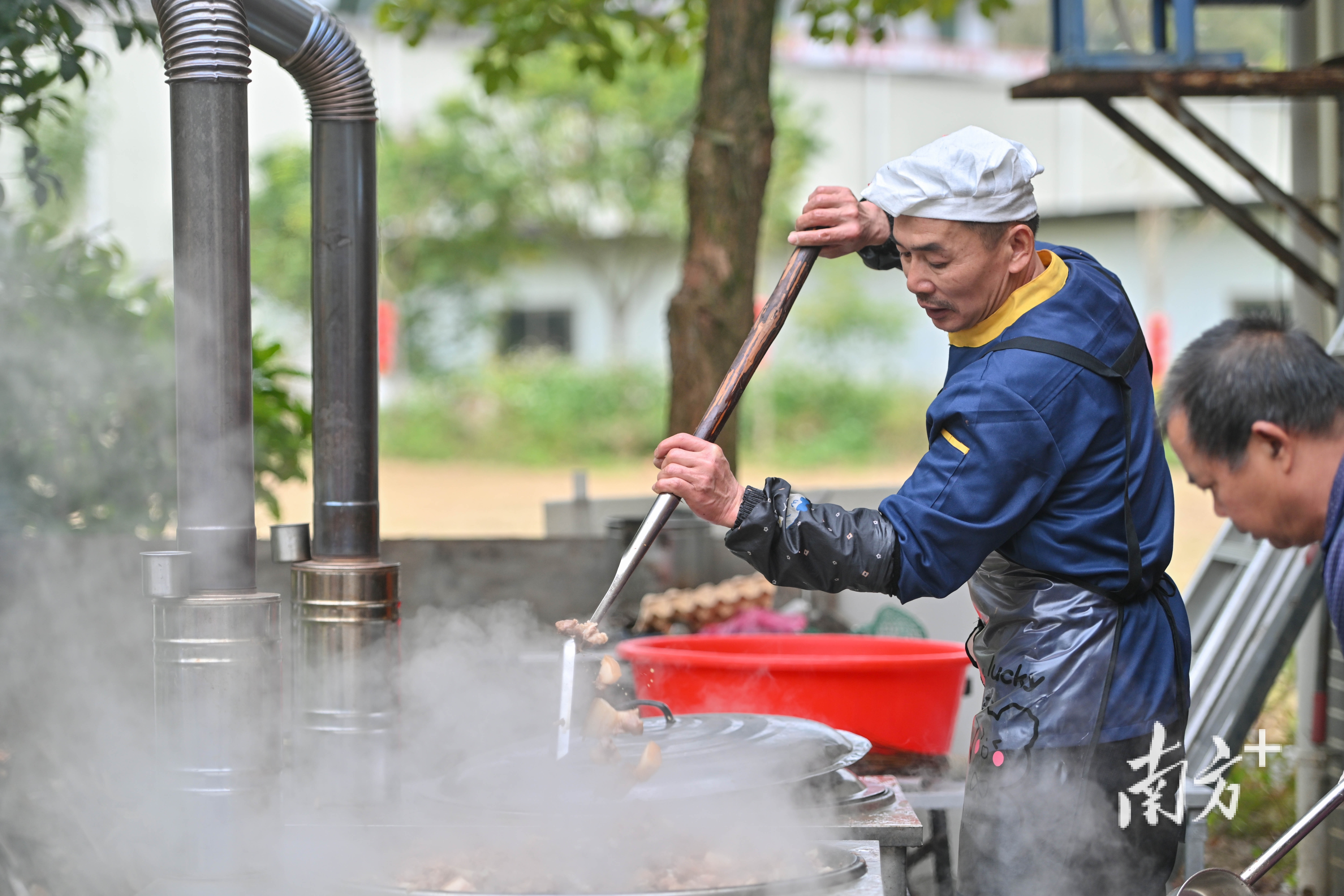 后厨区的大铁锅里,厨师将猪肉、猪肝、猪红翻滚了近四十分钟,保证炖得软熟方便老人食用。南方+记者 曾亮超 摄