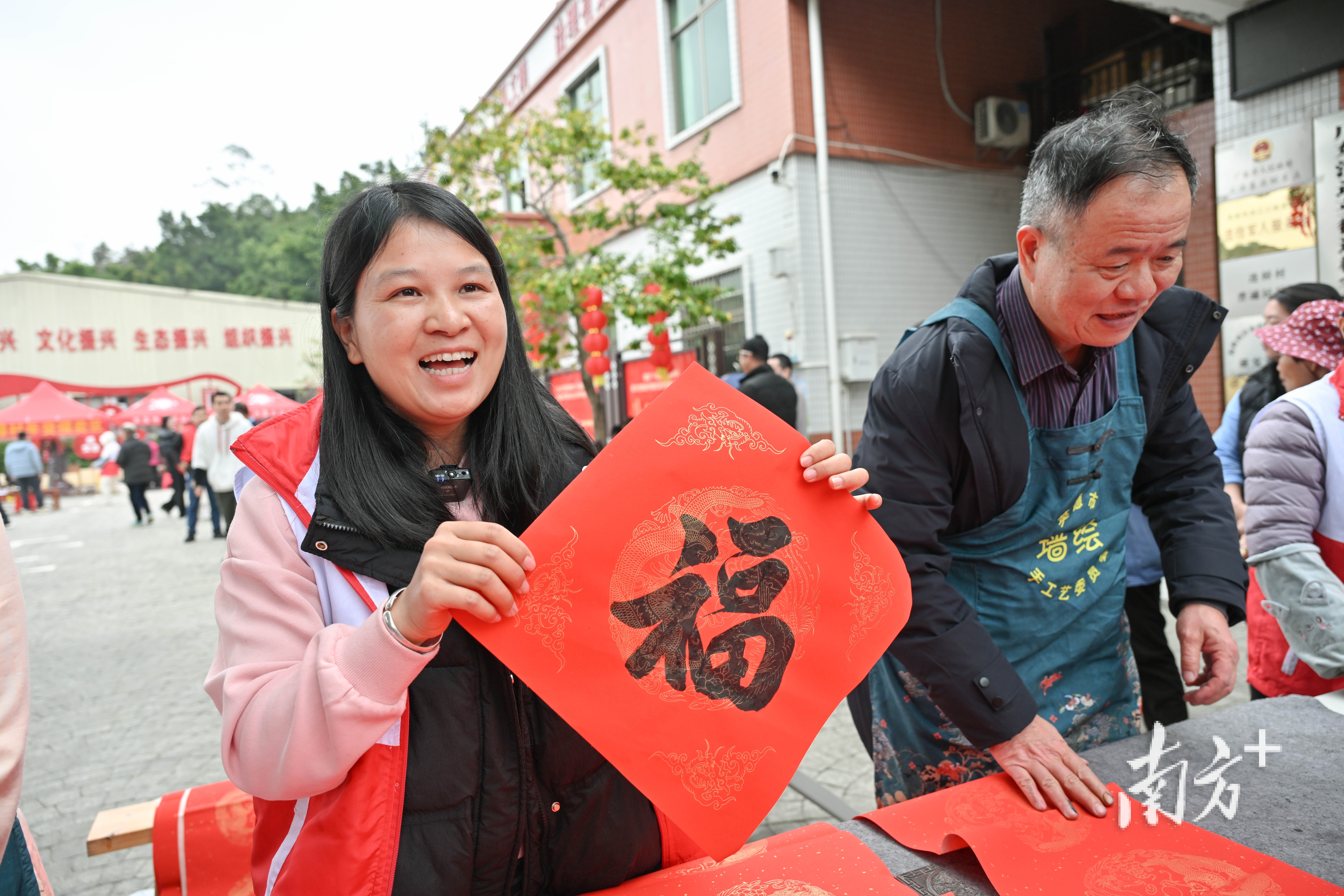 在春联区,傅雪珍在红纸与墨香间穿梭,忙着与书法老师一起为村民送“福”。南方+记者 曾亮超 摄