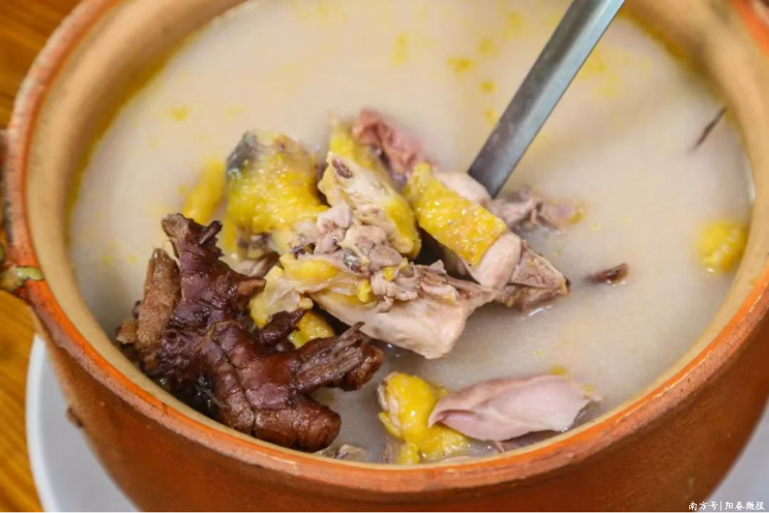 风姜鸡——阳春餐桌上不可或缺的“头道暖”。选用走地鸡与风姜同炖,香气四溢,暖身又暖心,寓意着新的一年“风生水起,吉祥如意”。