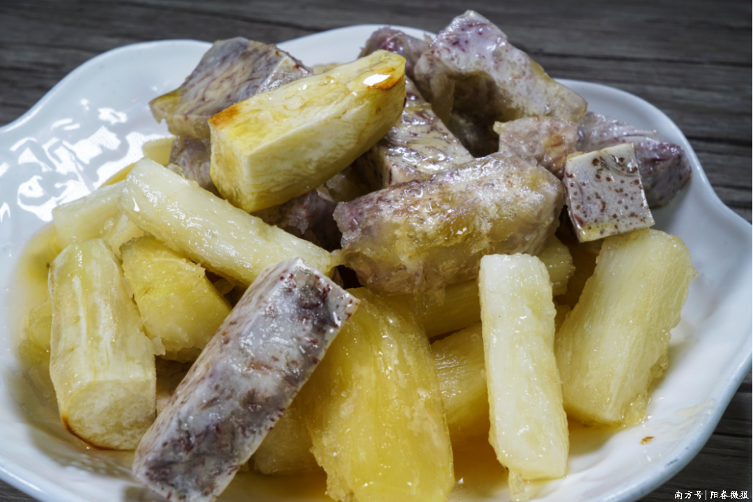 蜜汁三宝——“三宝”指的是番薯、芋头、淮山,用糖和蜜汁作为主要配料烹饪,入口松软甜蜜,三种原材料带给你各不相同的味觉享受。蜜汁三宝是阳春餐桌上必不可少的一味。