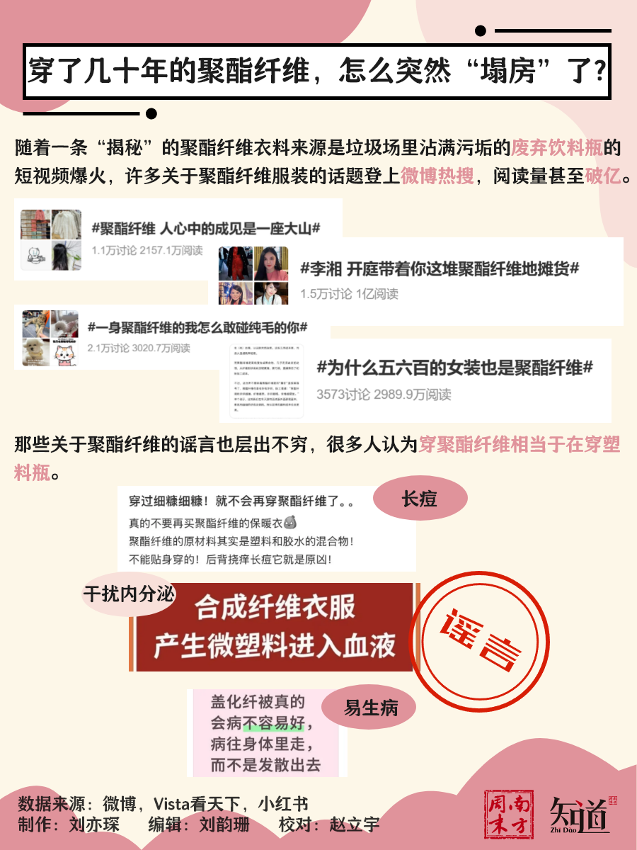 随着一条“揭秘”的聚酯纤维衣料来源是垃圾场里沾满污垢的废弃饮料瓶的短视频爆火,许多关于聚酯纤维服装的话题登上微博热搜,阅读量甚至破亿。
