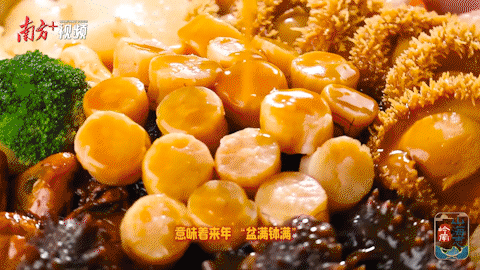 广货的“好意头”是一场舌尖上的祈福。煎堆碌碌,金银满屋;油角弯弯,家财百万。而盆菜作为广东年夜饭的绝对C位,一盆汇聚各路食材的盆菜意味着来年“盆满钵满”。年年有余、发财就手、风生水起……