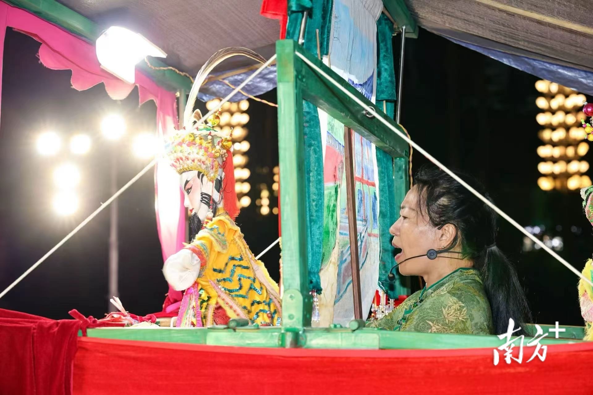 随后,茂南区木偶戏协会的老艺人们登台献艺,他们唱念做打样样精通,一人即成一台戏。当传承人周宏丽表演《岳云退金兵》时,木偶们在战场上跃马挺枪、激烈交锋的场景,引得台下阵阵喝彩。金戈铁马之声回荡在夜空,小小木偶仿佛真的拥有了万夫不当之勇。