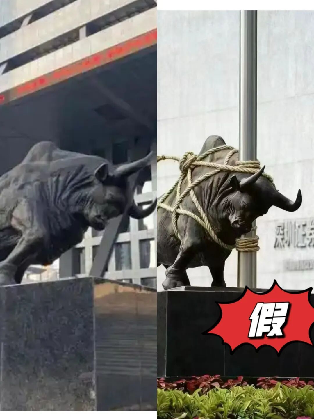 同日,有网民传播的图片显示,深交所门前的牛雕塑被用绳拴在一根柱子上。经观察发现,深交所的牛雕塑旁边并没有柱子,其背后也没有深交所的门牌字,相关图片疑似为AI工具制作的。