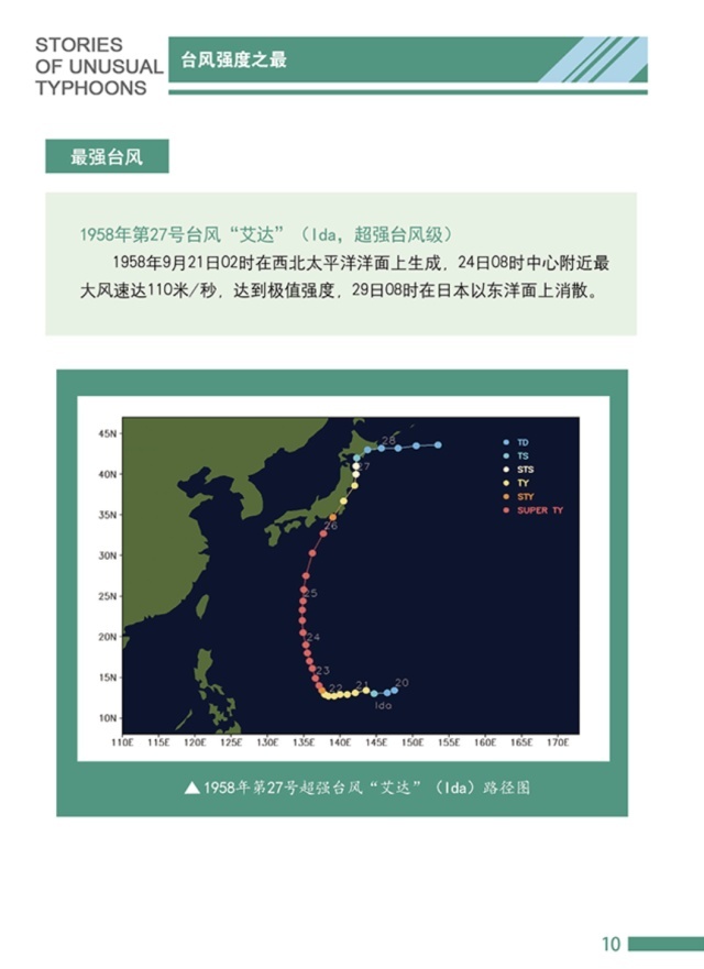 据中央气象台的记录,历史上最强台风为1958年第27号台风“艾达”,1958年9月21日2时在西北太平洋洋面上生成,24日8时中心附近最大风速达110米/秒;历史上平均风速最大的台风是1961年5月的台风“贝蒂”,平均风速74.7米/秒;历史上瞬时风速最大的台风为1984年7月的台风“亚力士”,瞬时风速89.8米/秒。