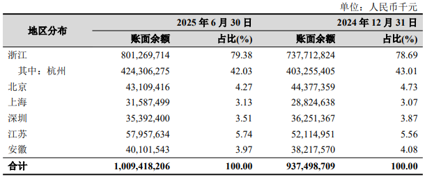 截至2025年上半年末,杭州银行在浙江地区的贷款余额占贷款总额比例为79.38%,杭州地区贷款余额占贷款总额42.03%;其余贷款分布在北京、上海、深圳、江苏、安徽等经济发达地区。