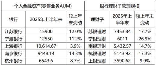 据财报,截至2025年6月,在A股上市的五大长三角城商行中,江苏银行零售AUM排名第一,达1.59万亿元;宁波银行(1.26万亿元)、上海银行(1.06万亿元)、南京银行(9448.1亿元)依次跟随,杭州银行排名末尾,且江苏银行、宁波银行、南京银行规模较去年末增幅均超10%。