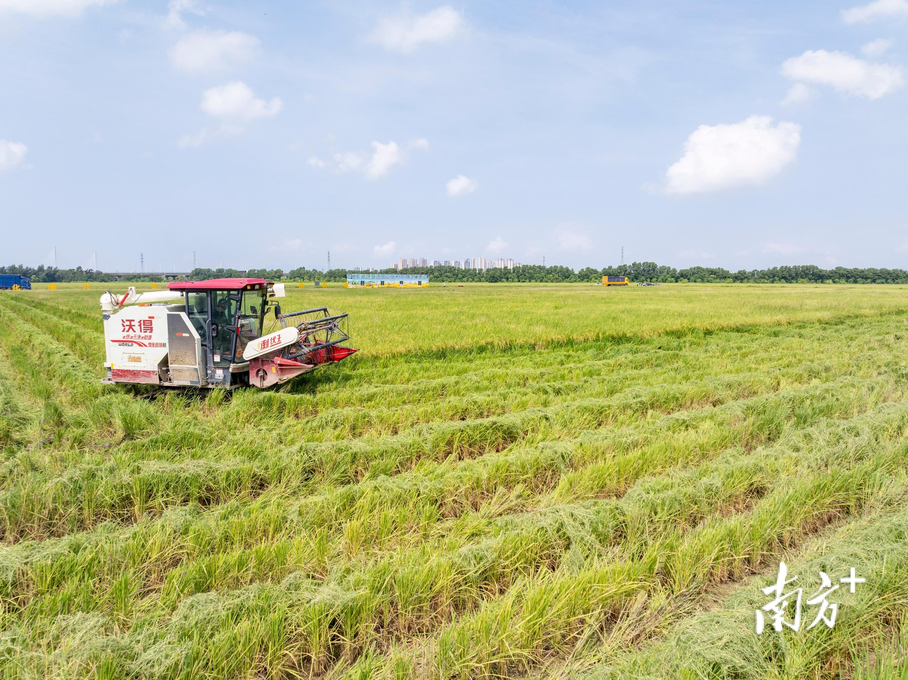 珠海市金湾区平沙镇水稻种植示范基地千亩盐碱地晚稻迎来集中收割期。南方+记者 关铭荣 摄