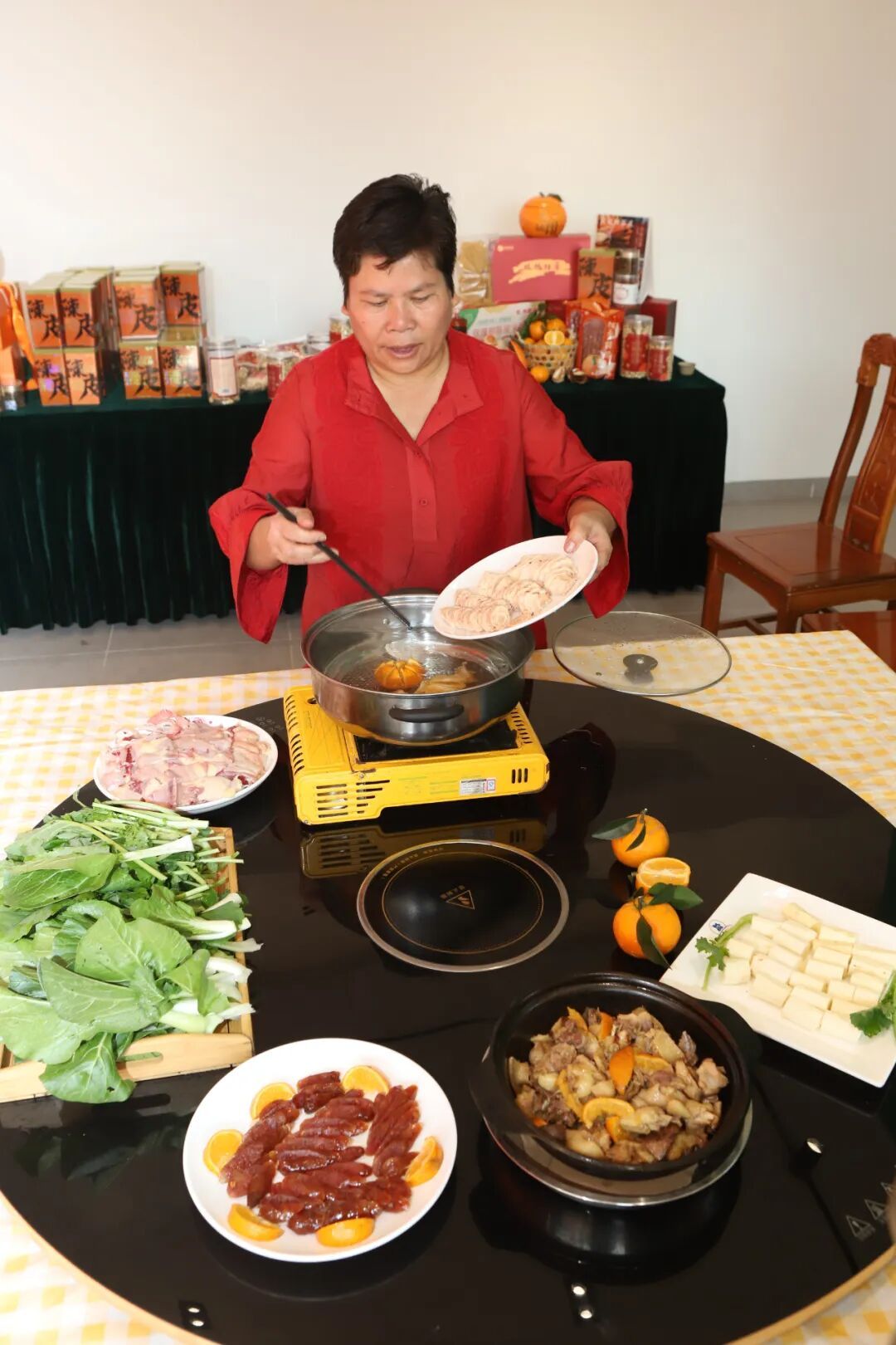 基于玫瑰柑的多元价值,园区构建起涵盖种植、加工、销售、服务的完整产业生态。在深加工领域,一系列玫瑰柑特色产品应运而生:玫瑰柑鸡煲将园区散养土鸡与新鲜柑肉同煮,果香与肉香交融;柑香腊肠以本地土猪肉为原料,融入玫瑰柑皮的清香,风味独特、咸香回甘;玫瑰柑皮花生、陈皮米线、柑香葵瓜子等休闲食品,成为游客争相购买的伴手礼。
