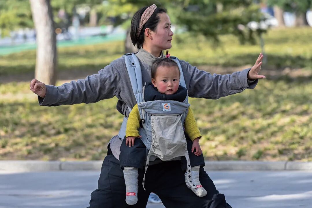2025年2月15日,北京。一位把孩子背在身前的妈妈正在练习太极。(图/CFP)