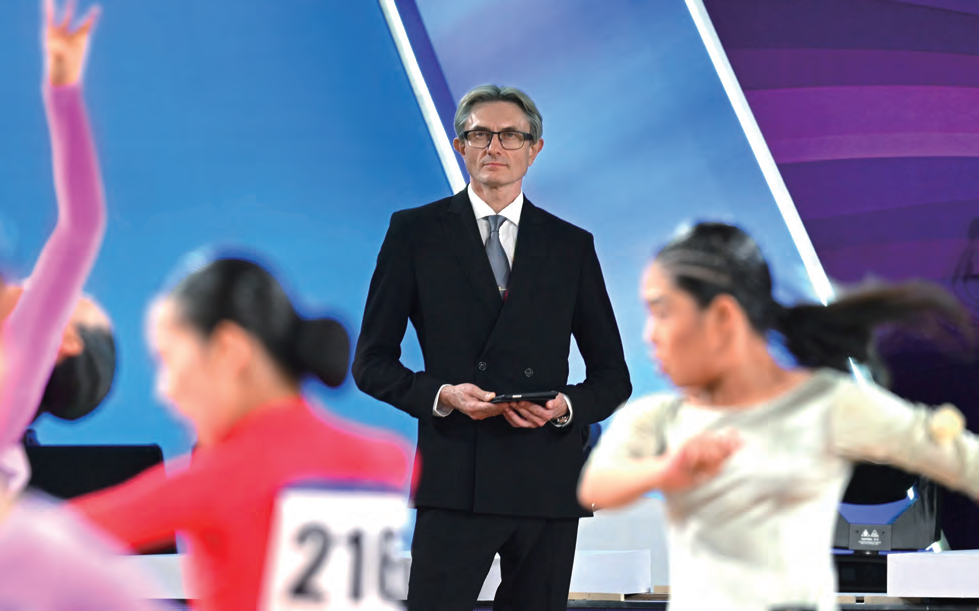 2025年9月20日,成都。此前意外走红、火爆全网的谢尔盖·辛金斯出现在第十三届世界体育舞蹈大赛上,引来现场观众的欢呼。(图/IC photo)