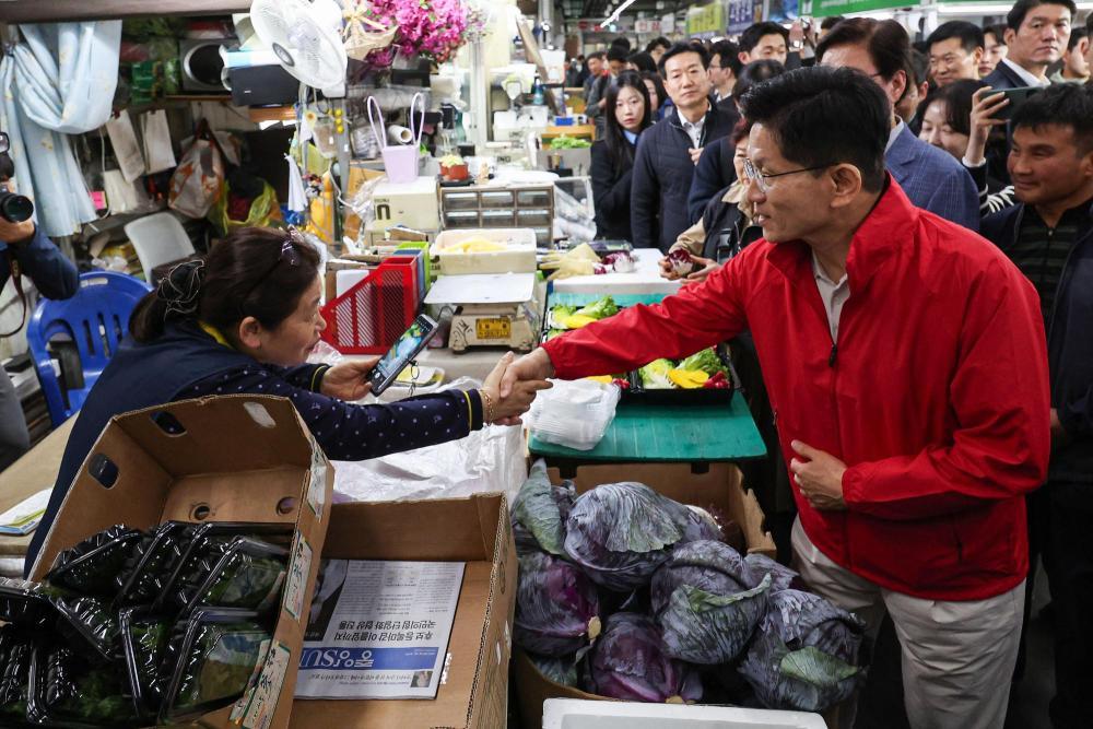 5月12日,执政党国民力量党候选人金文洙(右)在首尔一农贸市场与商户握手。新华社/纽西斯通讯社