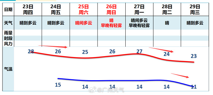 省气象台预计,23—25日,受弱冷空气影响,广东大部晴间多云;24—25日各市县气温下降1℃—3℃。昼夜温差大,早晚寒凉。