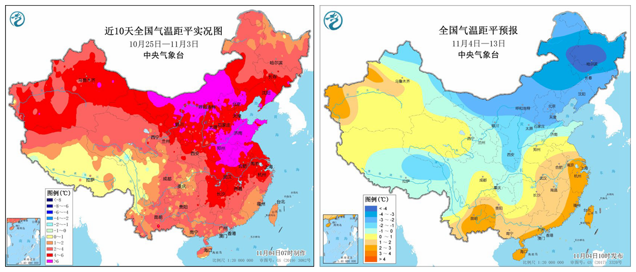 △过去十天全国气温距平图VS未来十天气温距平图。从暖热到偏冷。
