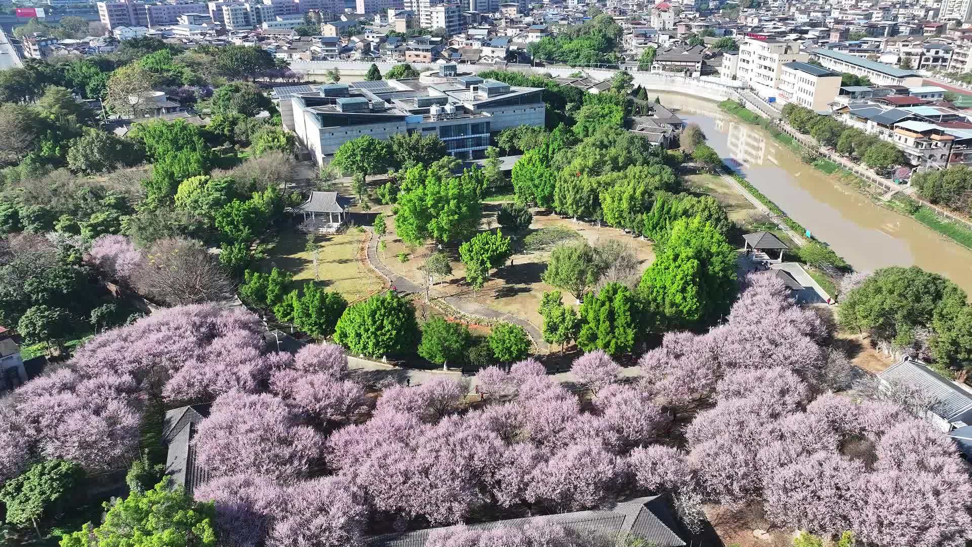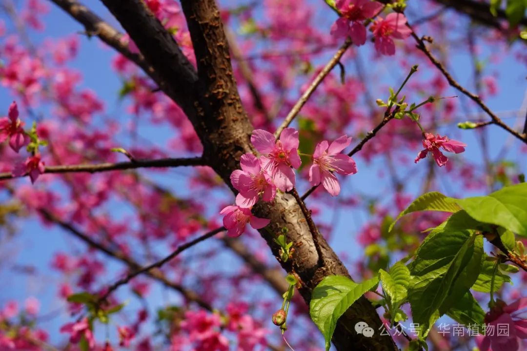 华南国家植物园樱花园中, “江山美人”“天适红”和“广州樱” 等品种陆续绽放。图源:华南植物园