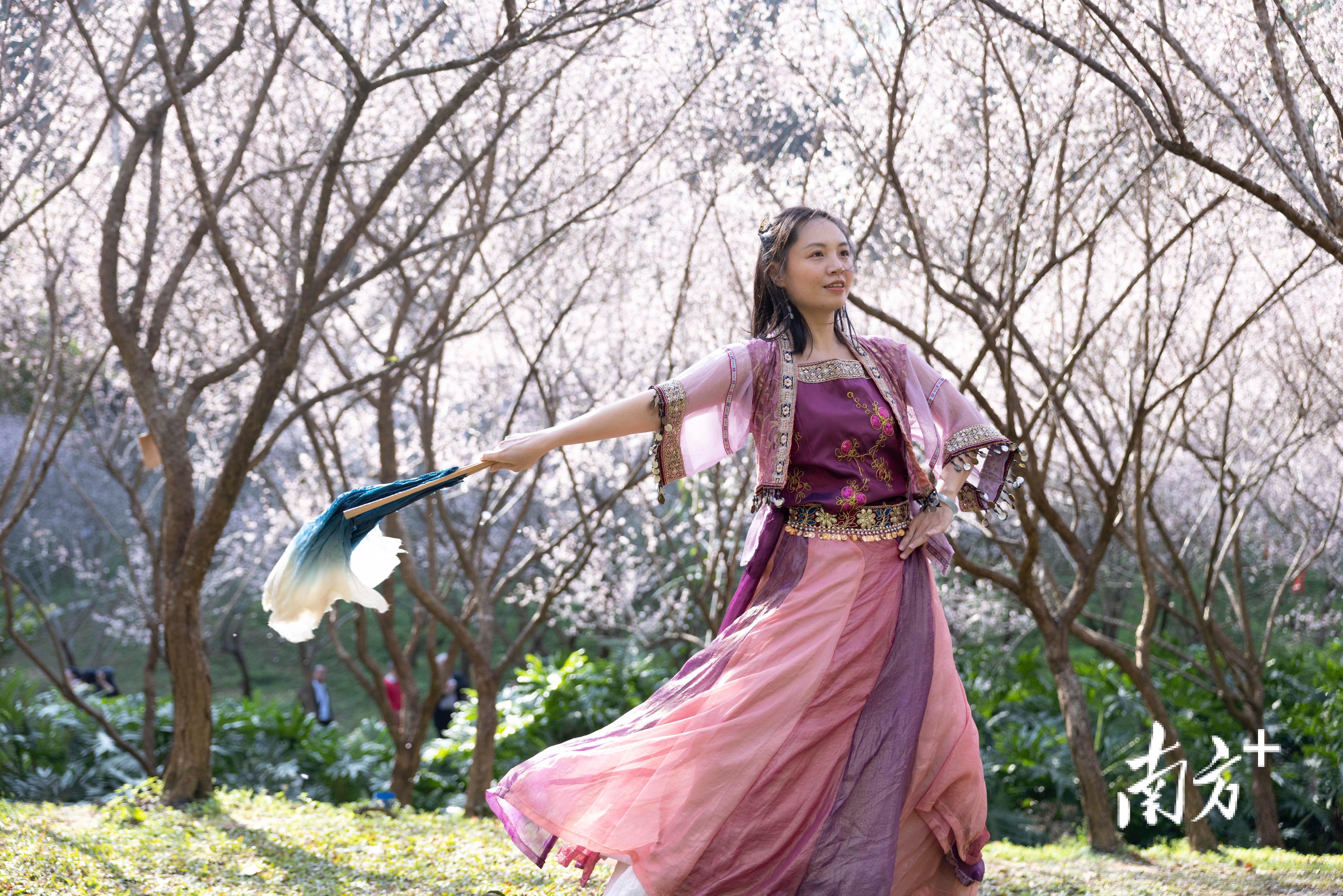 梅花谷中,身着华服的女孩在花下翩翩起舞。南方+记者 梁钜聪 摄