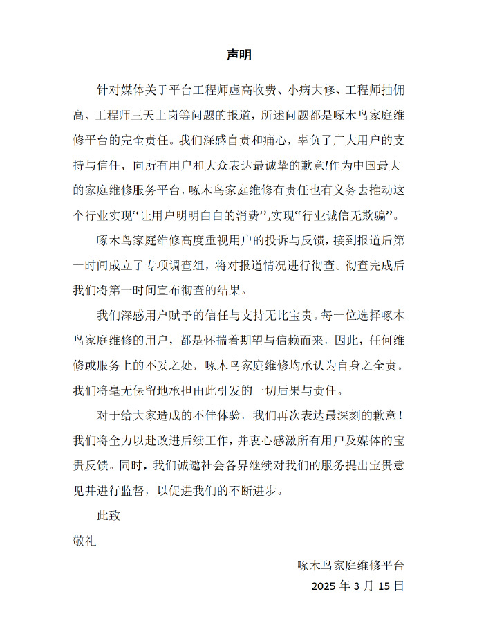 啄木鸟家庭维修就虚高收费致歉:深感自责和痛心,将改进后续工作