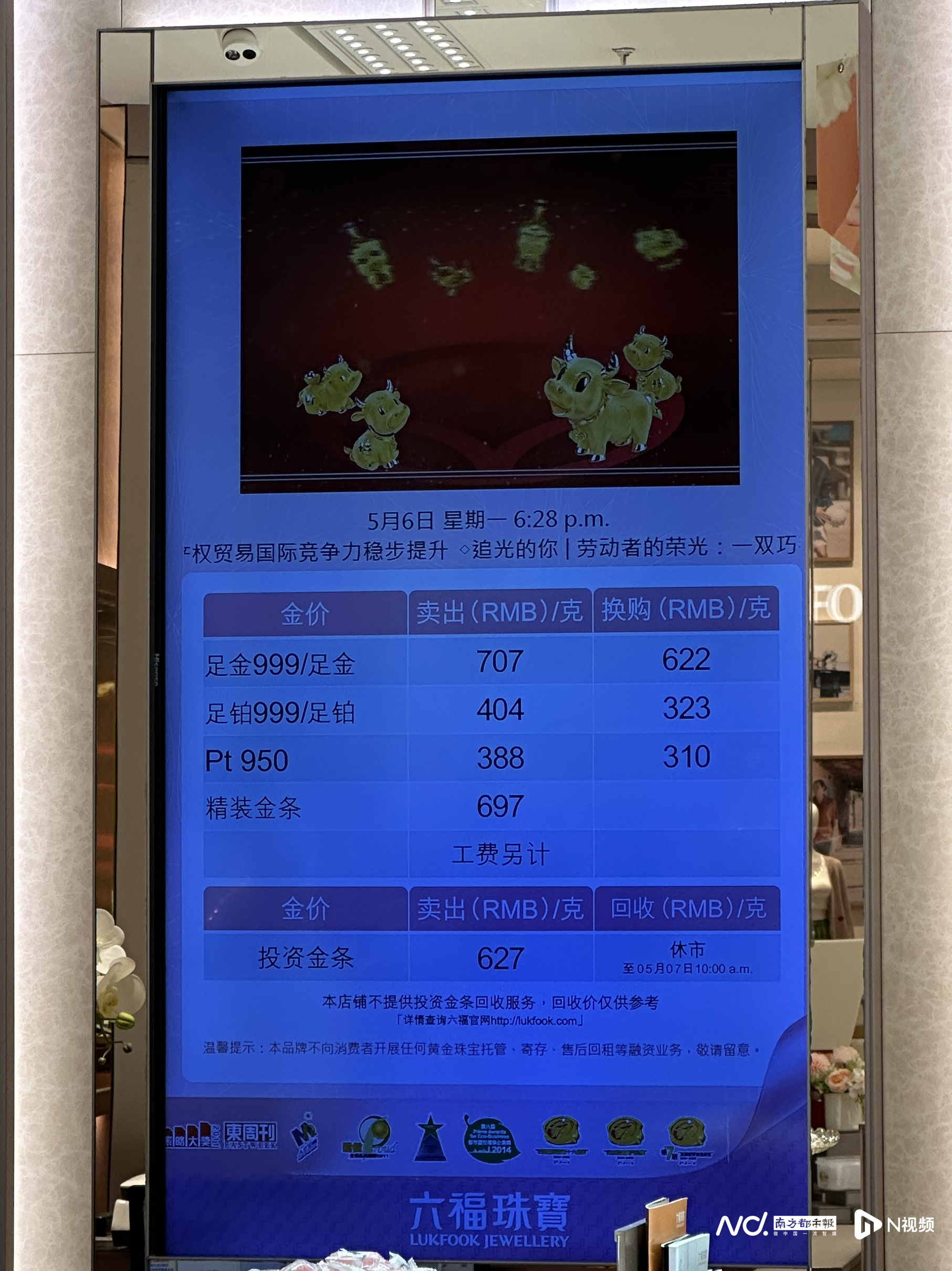 记者走访了解到,众多商家延续了“五一”小长假的优惠活动,如周生生、老凤祥、六福珠宝、金至尊等品牌黄金挂牌价均超700元/克,不过店内有不同程度的克减优惠,优惠后价格均低于700元/克。深圳市宝安区某商场周大福门店的工作人员则表示,今日店内金价为707元/克,不过店内无任何优惠活动。