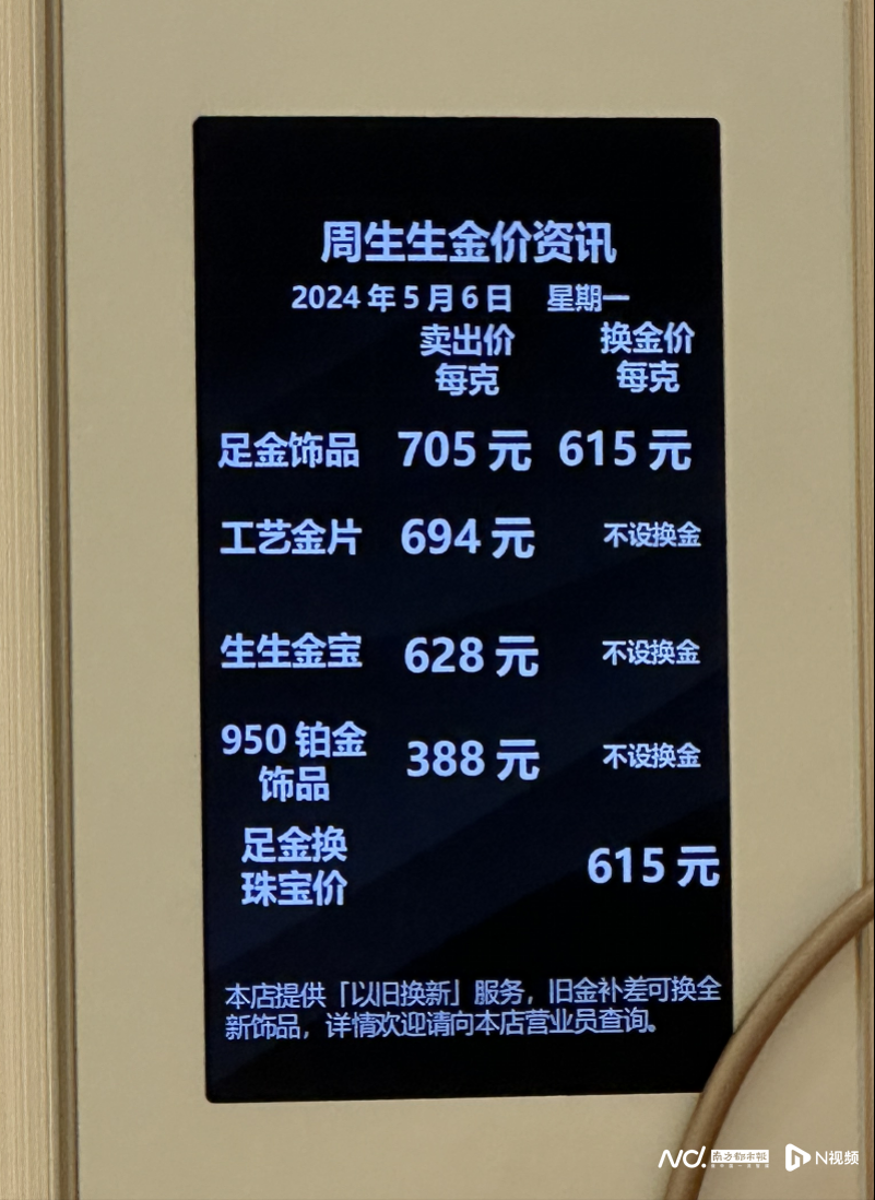 周生生门店的工作人员则告诉记者,店内足金饰品今日报价705元/克,店内有克减20元优惠,优惠后的价格是685元/克。“母亲节要到了,接下来我们店里也会推出母亲节专属的优惠活动。”该工作人员表示,与前段时间涨到730元/克相比,近期金价相对低了不少,也有很多顾客来咨询金价,准备买黄金饰品作为母亲节礼物。