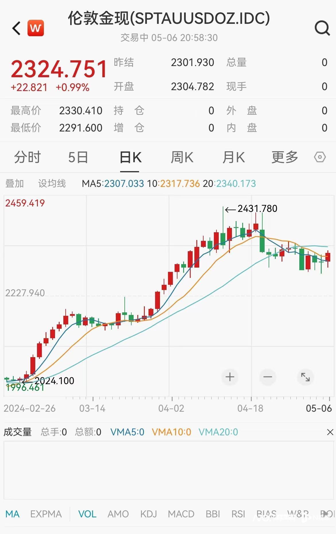 此外,Wind数据显示,伦敦黄金现货价格自4月12日创下历史新高2431.78美元/盎司之后,便展开震荡调整。仅“五一”小长假期间,伦敦现货黄金从2322.54美元/盎司下降至2301.53美元/盎司,降幅0.9%,盘中最低至2277.7美元/盎司,创下4月5日以来新低,其间累计最大跌幅达6.36%。