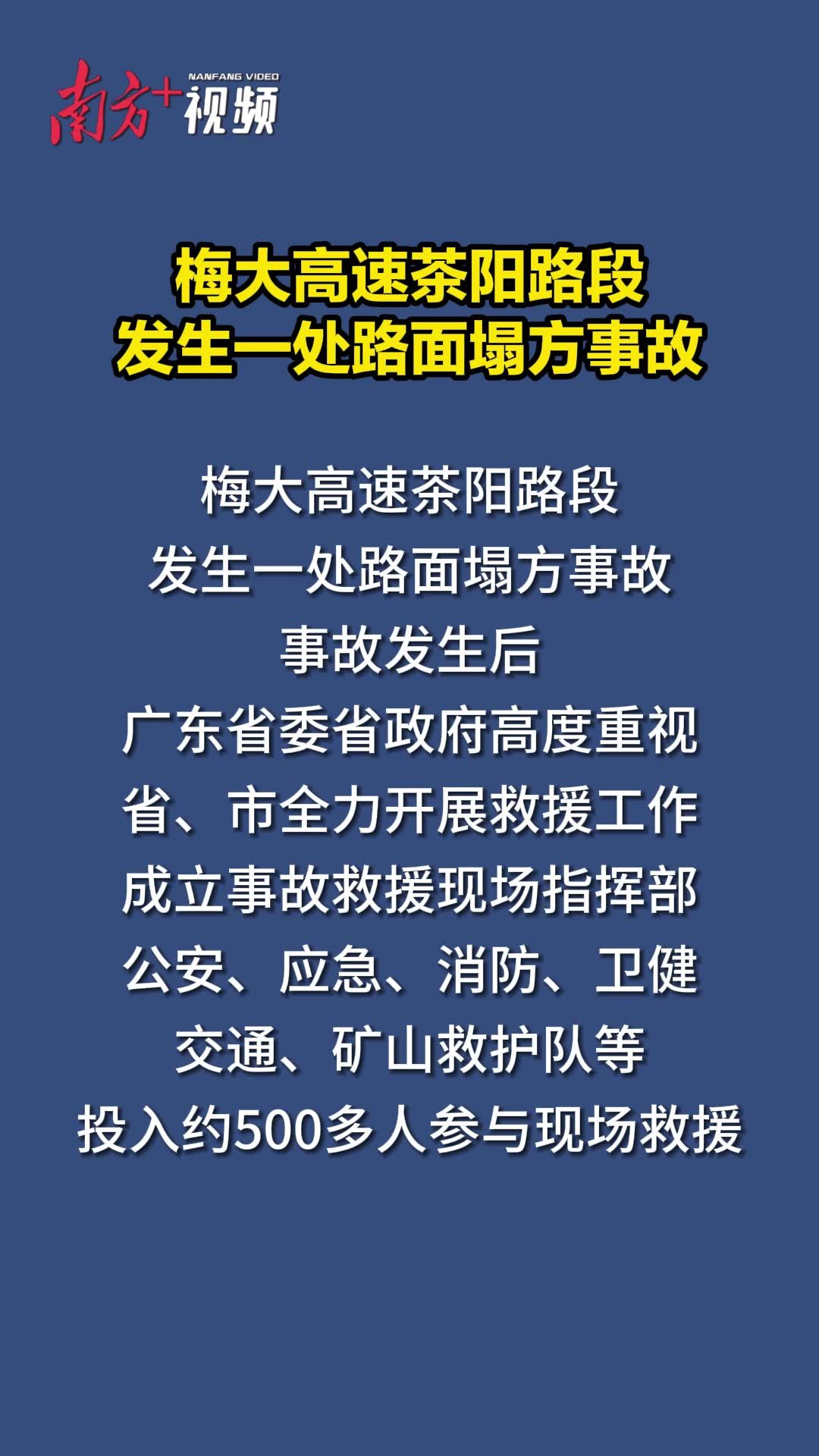 梅大高速茶阳路段发生一处路面塌方灾害,事件发生后,广东省委省政府高度重视,省、市全力开展救援工作,成立救援现场指挥部,公安、应急、消防、卫健、交通、矿山救护队等投入约500多人参与现场救援。